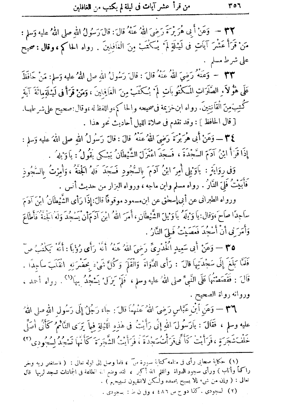 36 - وعن ابن عبَّاس رضي الله عنهما قال: جاء رجلٌ إلى رسول الله صلى الله عليه وسلم، فقال: يا رسول الله إنِّي رأيت في هذه الليلة فيما يرى النائم كأنِّي أصلِّي خلف شجرةٍ، فرأيت كأنِّي قرأت سجدةً، فرأيت الشجرة كأنَّها تسجد لسجودي (¬2)