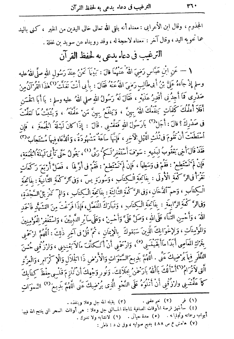1 - عن ابن عباس رضي الله عنهما قال: بينهما نحن عند رسول الله صلى الله عليه وسلم إذْ جاءه عليُّ بن أبي طالبٍ رضي الله عنه فقال: بأبي أنت تفلَّت (¬1) هذا القرآن من صدري فما أجدني أقدر عليه، فقال له رسول الله صلى الله عليه وسلم: يا أبا الحسن أفلا أعلِّمك كلماتٍ ينفعك الله بهنَّ، وينفع بهنَّ من علَّمته، ويثبِّت ما تعلَّمت في صدرك؟ قال: أجل (¬2) يا رسول الله فعلمني. قال: إذا كان ليلة الجمعة، فإن استطعت أن تقوم في ثلث الليل الآخر، فإنها ساعة مشهودة، والدعاء فيها مستجاب (¬3) فقد قال أخي يعقوب لبنيه: سوف أستغفر لكمْ ربِّي (¬4)، يقول حتى تأتي ليلة الجمعة، فإنْ لم تستطع: فقمْ في وسطها، فإنْ لم تستطع: فقمْ في أوَّلها، فصلِّ أربع ركعاتٍ تقرأ في الرَّكعة الأولى: بفاتحة الكتاب، وسورة يس، وفي الرَّكعة الثانية: بفاتحة الكتاب، وحم الدُّخان، وفي الرَّكعة الثالثة: بفاتحة الكتاب، وألم تنزيل السَّجدة، وفي الرَّكعة الرابعة: بفاتحة الكتاب، وتبارك المفصل، فإذا فرغت من التشهد فاحمد الله، وأحسن الثناء على الله، وصلِّ عليَّ وأحسنْ، وعلى سائر النبيين، واستغفر للمؤمنين والمؤمنات، ولإخوانك الذين سبقون بالإيمان، ثم قل في آخر ذلك: اللهمَّ ارحمني بترك المعاصي أبداً ما أبقيتني (¬5)، وارحمني أن أتكلف ما لا يعنيني، وارزقني حسن النظر فيما يرضيك عنِّي. اللهمَّ بديع السماوات والأرض ذا الجلال والإكرام، والعزَّة التي لا ترام (¬6) أسألك يا ألله يا رحمن بجلالك. ونور وجهك أن تلزم قلبي حفظ كتابك كما علَّمتني وارزقني أن أتلوه على النَّحو الذي يرضيك عني اللهمَّ بديع (¬7) السموات