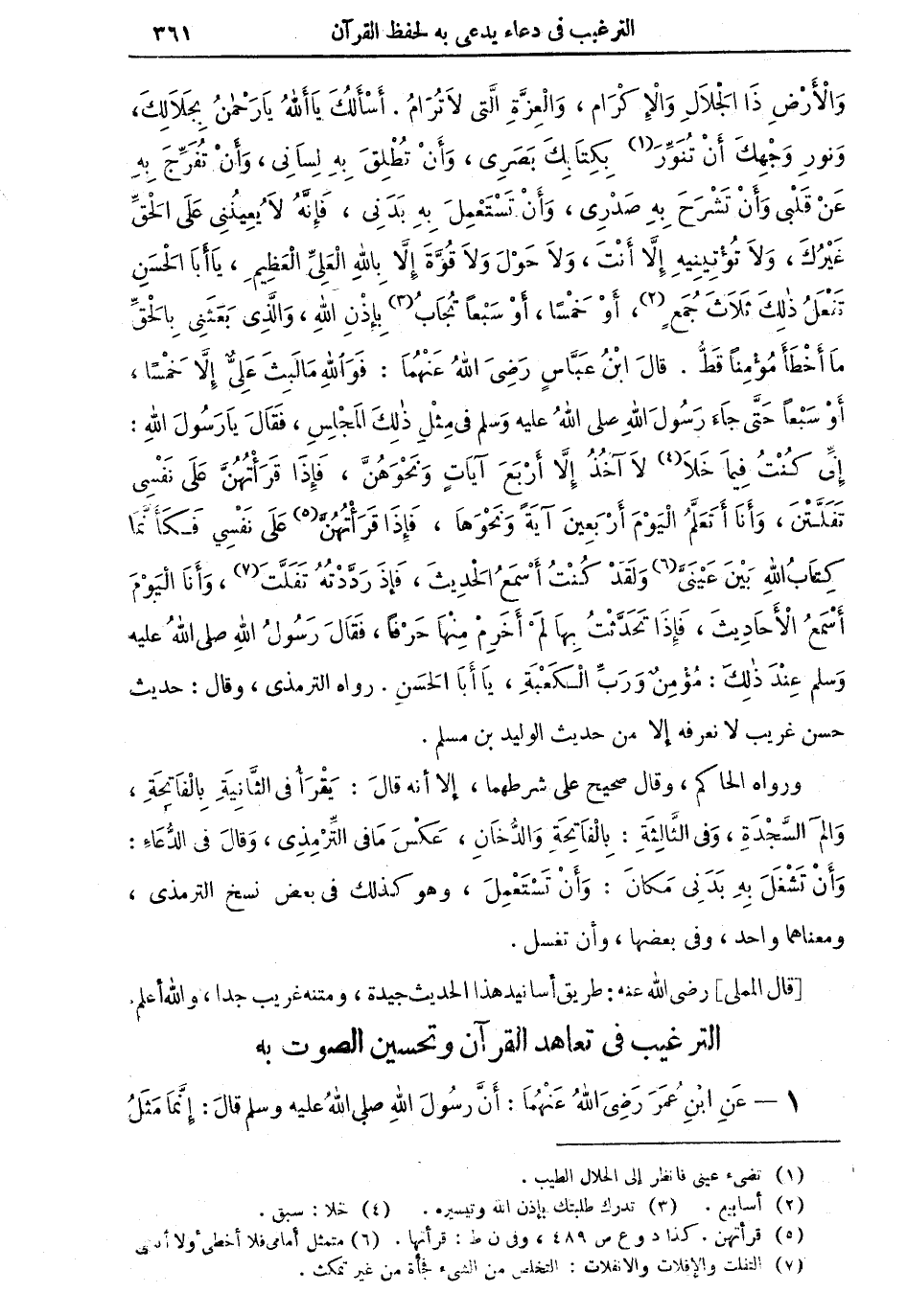 والأرض ذا الجلال والإكرام، والعزَّة التي لا ترام. أسألك يا ألله يا رحمن بجلالك، ونور وجهك أن تنوِّر (¬1) بكتابك بصري، وأن تطلق به لساني، وأن تفرِّج به عنْ قلبي وأن تشرح به صدري، وأن تستعمل به بدني، فإنه لا يعينني على الحقِّ غيرك، ولا يؤتينيه إلا أنت، ولا حول ولا قوة إلا بالله العلي العظيم، يا أبا الحسن تفعل ذلك ثلاث جمعٍ (¬2)، أوْ خمسا، أو سبعاً تجاب (¬3) بإذن الله، والذي بعثني بالحق ما أخطأ مؤمناً قطُّ. قال ابن عباسٍ رضي الله عنهما: فوالله ما لبث عليٌّ إلا خمساً، أو سبعاً حتى جاء رسول الله صلى الله عليه وسلم في مثل ذلك المجلس، فقال يا رسول الله: إني كنت فيما خلا (¬4) لا آخذ إلا أربع آيات ونحوهن, فإذا قرأتهن على نفسي تفلتن, وأنا أتعَلَّمُ اليوم أربعين آية ونحوها، فإذا قرأتهنَّ (¬5) على نفسي فأكنما كتاب الله بين عينيَّ (¬6) ولقد كنت أسمع الحديث، فإذا ردَّدْته تفلَّت (¬7)، وأنا اليوم أسمع الأحاديث، فإذا تحدَّثت بها لمْ أخرم منها حرفاً، فقال رسول الله صلى الله عليه وسلم عند ذلك: مؤمن وربِّ الكعبة، يا أبا الحسن. رواه الترمذي، وقال: حديث حسن غريب لا نعرفه إلا من حديث الوليد بن مسلم.
