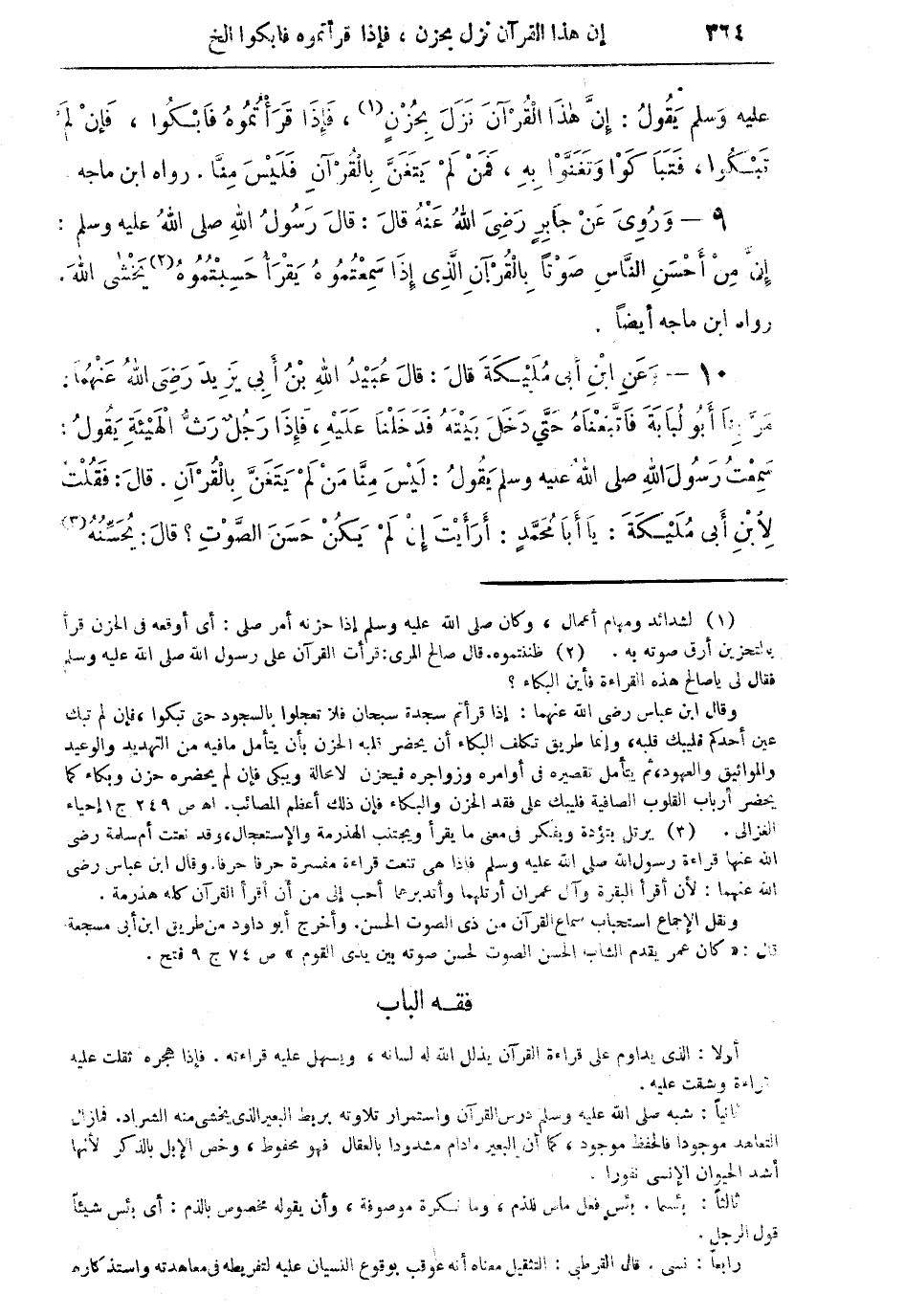 10 - وعن ابن أبي مليكة قال: قال عبيد الله بن أبي يزيد رضي الله عنهما: مرَّ بنا أبو لبابة فاتَّبعناه حتى دخل بيته فدخلنا عليه، فإذا رجلٌ رثُّ الهيئة يقول: سمعت رسول الله صلى الله عليه وسلم يقول: ليس منَّا من لمْ يتغنَّ بالقرآن. قال: فقلتُ لابن أبي مليكة: يا أبا محمدٍ: أرأيت إنْ لمْ يكنْ حسن الصَّوْتِ؟ قال: يحسِّنُه (¬3)