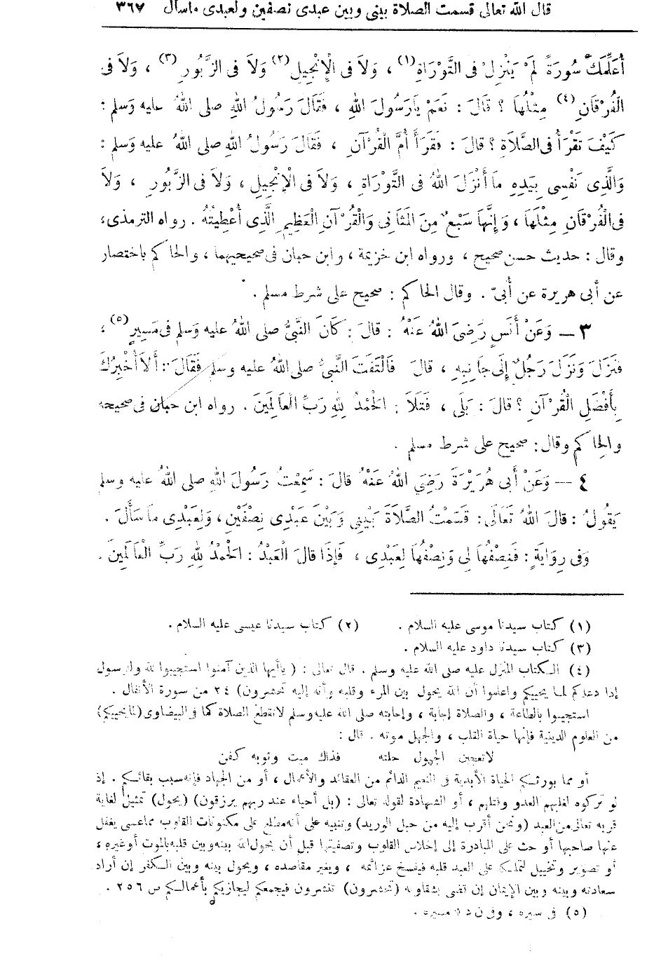 مثلها؟ قال: نعم يا رسول الله، فقال رسول الله صلى الله عليه وسلم: كيف تقرأ في الصلاة؟ قال: فقرأ أمَّ القرآن، فقال رسول الله صلى الله عليه وسلم: والذي نفسي بيدهِ ما أنزل الله في التَّوراة، ولا في الإنجيل، ولا في الزَّبور، ولا في الفرقان مثلها، وإنها سبعٌ من المثاني والقرآن العظيم الذي أعطيته. رواه الترمذي، وقال: حديث حسن صحيح، ورواه ابن خزيمة، وابن حبان في صحيحهما، والحاكم باختصار عن أبي هريرة عن أبي. وقال الحاكم: صحيح على شرط مسلم.