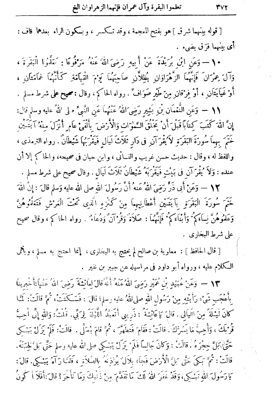 10 - وعن ابن بريدة عن أبيه رضي الله عنه مرفوعاً: تعلَّموا البقرة وآل عمران فإنَّهما الزهراوان يظلان صاحبهما يوم القيامة كأنهما غمامتان، أو غيايتان، أو فرقانْ منْ طيرٍ صوافَّ. رواه الحاكم، وقال: صحيح على شرط مسلم.