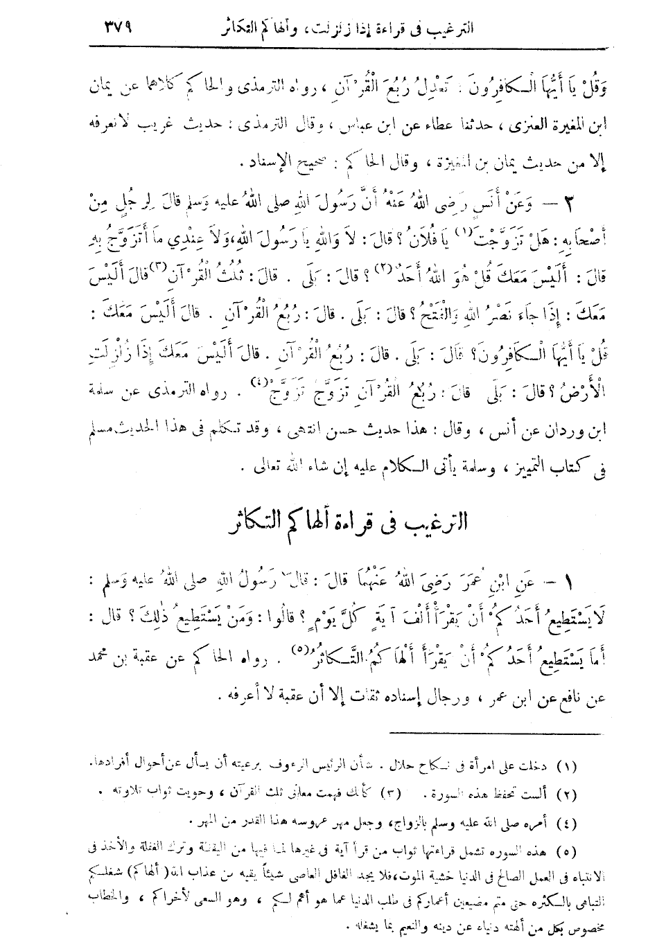 1 - عن ابن عمر رضي الله عنهما قال: قال رسول الله صلى الله عليه وسلم: لا يستطيع أحدكمْ أن يقرأ ألف آيةٍ كلَّ يومٍ؟ قالوا: من يستطيع ذلك؟ قال: أما يستطيع أحدكم أن يقرأ لها كم التكاثر (¬5). رواه الحاكم عن عقبة بن محمد بن نافع عن ابن عمر، ورجال إسناده ثقات إلا أن عقبة لا أعرفه.