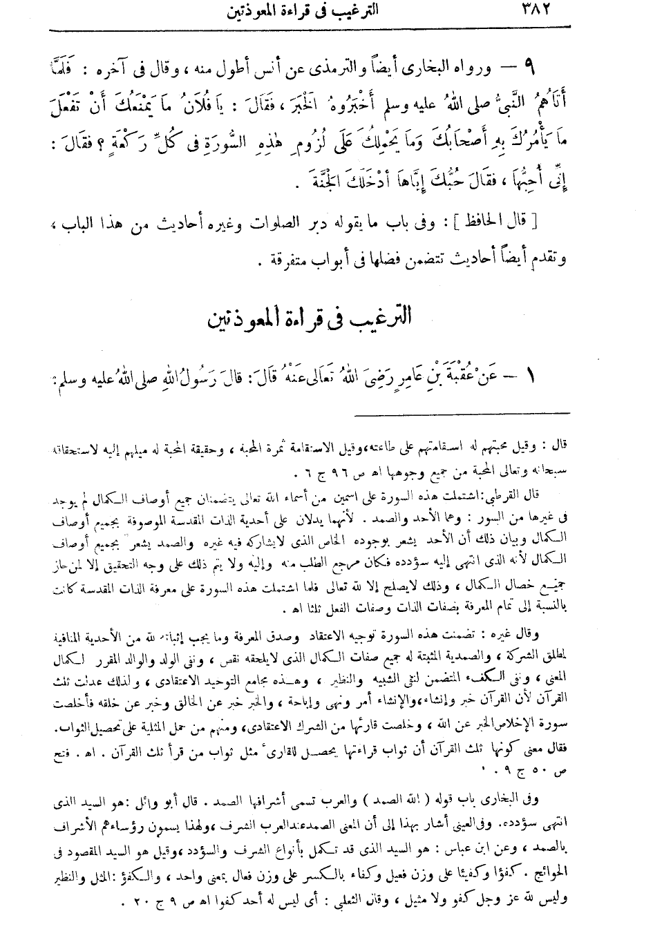 9 - ورواه البخاري أيضاً والترمذي عن أنس أطول منه، وقال في آخره: فلمَّا أتاهم النبيُّ صلى الله عليه وسلم أخبروه الخبر، فقال: يا فلان ما يمنعك أن تفعل ما يأمرك به أصحابك وما يحملك على لزوم هذه السورة في كلِّ ركعةٍ؟ فقال: إنِّي أحبها، فقال حُبُّك إيَّاها أدخلك الجنَّة.