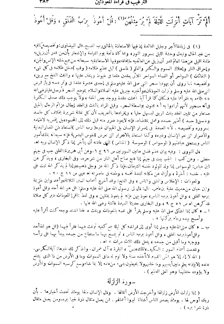 قال النووي: وفيه بيان عظم فضل هاتين السورتين ص 96 جـ 6، وعن أبي هريرة: الفلق جب في جهنم مغطى، وعن كعب: الجب بيت في جهنم إذا فتح صاح أهل النار من شر حره، وفي البخاري، ويذكر عن ابن عباس: الوسواس إذا ولد المولود خنسه الشيطان. فإذا ذكر الله عز وجل ذهب، وإذا لم يذكر الله ثبت على قلبه. خنسه: أخره، وأزاله عن مكانه لشدة نخسه، وطعنه في خاصرته. أهـ عيني ص 11 جـ 20.