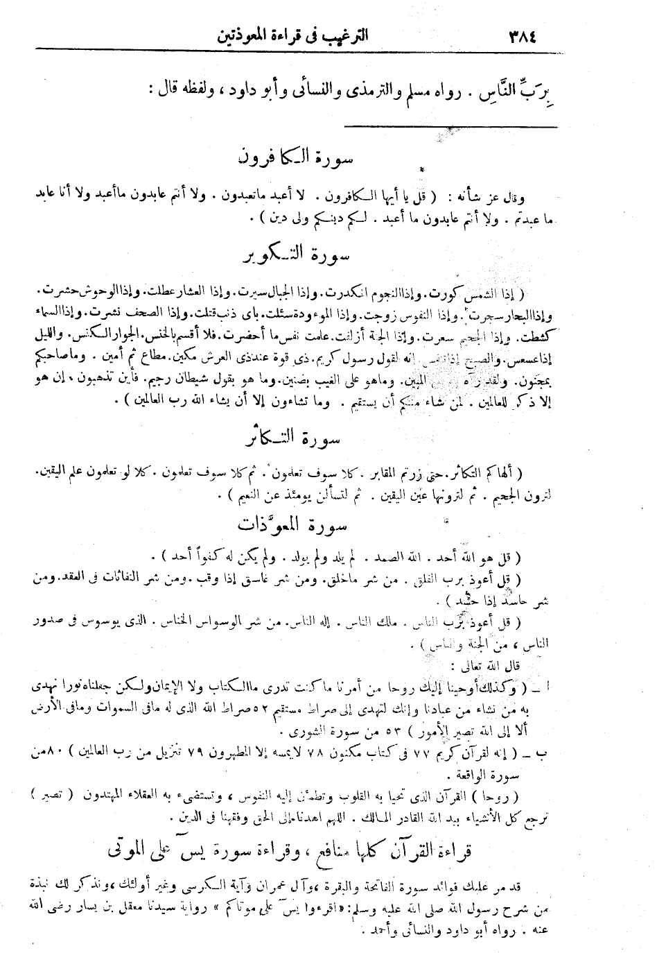 (قل أعوذ برب الناس. ملك الناس. إله الناس. من شر الوسواس الخناس. الذي يوسوس في صدور الناس. من الجنة والناس).