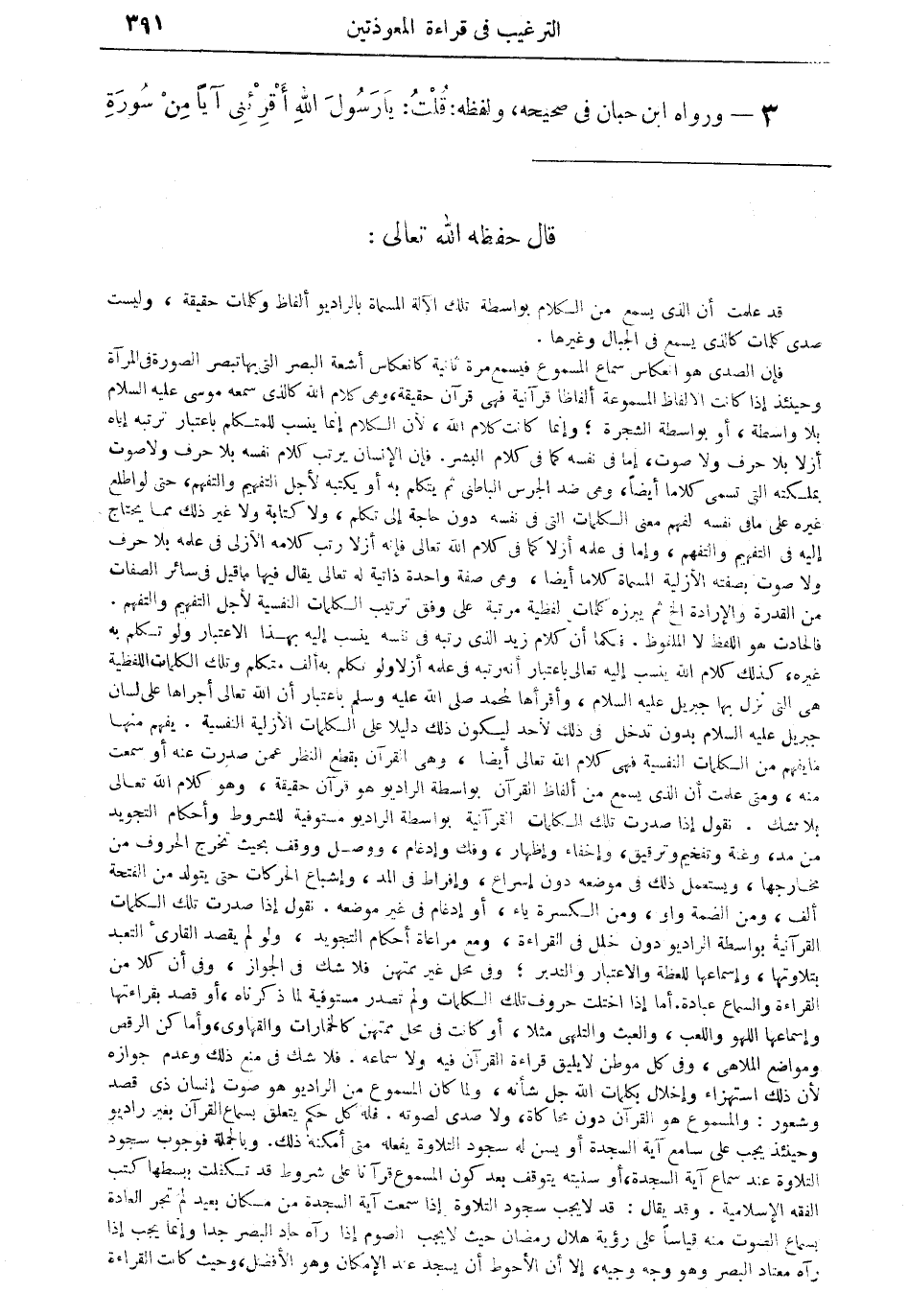 فالحادث هو اللفظ لا الملفوظ. فكان أن كلام زيد الذي رتبه في نفسه ينسب إليه بهذا الاعتبار ولو تكلم به غيره، كذلك كلام الله ينسب إليه تعالى باعتبار أنه رتبه في علمه أزلا ولو تكلم به ألف متكلم وتلك الكلمات اللفظية هي التي نزل بها جبريل عليه السلام، وأقرأها لمحمد صلى الله عليه وسلم باعتبار أن الله تعالى أجراها على لسان جبريل عليه السلام بدون تدخل في ذلك لأحد ليكون ذلك دليلا على الكلمات الأزلية النفسية. يفهم منها ما يفهم من الكلمات النفسية فهي كلام الله تعالى أيضا، وهي القرآن بقطع النظر عمن صدرت عنه أو سمعت منه، ومتى علمت أن الذي يسمع من ألفاظ القرآن بواسطة الراديو هو قرآن حقيقة، وهو كلام الله تعالى بلا شك. نقول إذا صدرت تلك الكلمات القرآنية بواسطة الراديو هو قرآن حقيقة، وهو كلام الله تعالى بلا شك. نقول إذا صدرت تلك الكلمات القرآنية بواسطة الراديو مستوفية للشروط وأحكام التجويد من مد وغنة: وتفخيم وترقيق، وإخفاء وإظهار، وفك وادغام، ووصل ووقف بحيث تخرج الحروف من مخارجها، ويستعمل ذلك في موضعه دون إسراع، وإفراط في المد، وإشباع الحركات حتى يتولد من الفتحة ألف، ومن الضمة واو، ومن الكسرة ياء، أو إدغام في غير موضعه. نقول إذا صدرت تلك الكلمات القرآنية بواسطة الراديو دون خلل في القراءة، ومع مراعاة أحكام التجويد، ولو لم يقصد القارئ التعبد بتلاوتها، وإسماعيل للعظة والاعتبار والتدبر، وفي محل غير ممتهن. فلا شك في الجواد، وفي أن كلا من القراءة والسماع عبادة. أما إذا اختلت حروف تلك الكلمات ولم تصدر مستوفية لما ذكرناه، أو قصد بقراءتها وإسماعيل اللهو واللعب، والعبث والتلهي مثلا، أو كانت في محل ممتهن كالخمارات والقهاوي، وأماكن الرقص ومواضع الملاهي، وفي كل موطن لا يليق قراءة القرآن فيه ولا سماعه. فلا شك في منع ذلك وعدم جوازه لأن ذلك استهزاء وإخلال بكلمات الله جل شأنه، ولما كان المسموع من الراديو هو صوت إنسان ذي قصد وشعور: والمسموع هو القرآن دون محاكاة، ولا صدى لصوته. فله كل حكم يتعلق بسماع القرآن بغير راديو وحينئذ يجب على سامع آية السجدة أو يسن له سجود التلاوة يفعله متى أمكنه ذلك. وبالجملة فوجوب سجود التلاوة عند سماع آية السجدة، أو سنيته يتوقف بعد كون المسموع قرآنا على شروط قد تكفلت ببسطها كتب الفقه الإسلامية، وقد يقال: قد لا يجب سجود التلاوة إذا سمعت آية السجدة من مكان بعيد لم تجر العادة بسماع الصوت منه قياسا على رؤية هلال رمضان حيث لا يجب الصوم إذا رآه حاد البصر جدا وإنما يجب إذا رآه معتدل البصر وهو وجه وجيه، إلا أن الأحوط أن يسجد عند الإمكان وهو الأفضل، وحيث كانت القراءة =