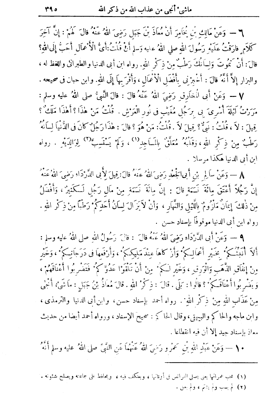 9 - وعنْ أبي الدرداء رضي الله عنه قال: قال رسول الله صلى الله عليه وسلم: ألا أنبِّئكمْ بخير أعمالكم وأزكاها عند مليككمْ، وأرفعها في درجاتكم، وخيرٍ من إنفاق الذَّهب والورق، وخيرٍ لكمْ من أن تلقوا عدوَّكمْ فتضربوا أعناقهم، ويضربوا أعناقكمْ؟ قالوا: بلى قال: ذكر الله. قال معاذ بن جبلٍ: ما شيءٌ أنجي منْ عذاب الله من ذكرِ الله. رواه أحمد بإسناد حسن، وابن أبي الدنيا والترمذي، وابن ماجه والحاكم والبيهقي، وقال الحاكم: صحيح الإسناد، ورواه أحمد أيضاً من حديث م عاذ بإسناد جيد إلا أن فيه انقطاعا.