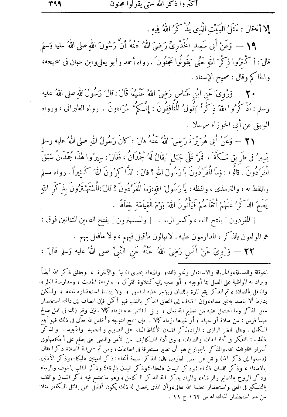 21 - وعنْ أبي هريرة رضي الله عنه قال: كان رسول الله صلى الله عليه وسلم يسير في طريق مكَّة، فمرَّ علي جبلٍ يقال له جمدان، فقال: سيروا هذا جمدان سبق المفرِّدون. قالوا: وما المفرِّدون يا رسول الله؟ قال: الذاكرون الله كثيراً. رواه مسلم واللفظ له، والترمذي، ولفظه: يا رسول الله: وما المفرِّدون؟ قال: المستهترون بذكر الله يضع الذِّكر عنهمْ أثقالهمْ فيأتون الله يوم القيامة خفافاً.
