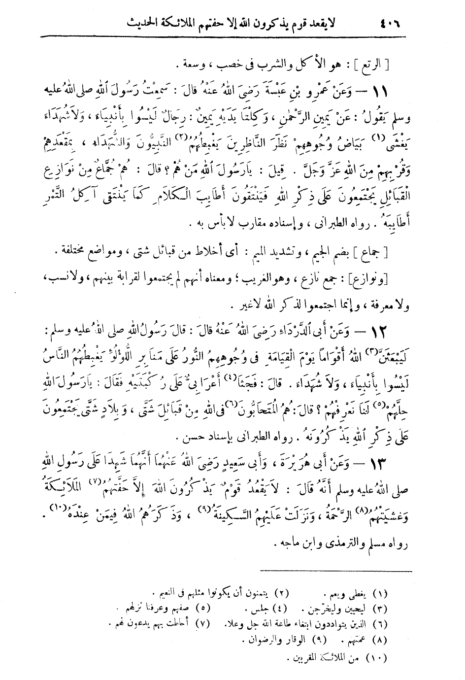11 - وعنْ عمرو بن عبسة رضي الله عنه قال: سمعتُ رسول الله صلى الله عليه وسلم يقول: عنْ يمين الرَّحمن، وكلتا يديه يمين: رجال ليسوا بأنبياء، ولا شهداء يغشى (¬1) بياض وجوههمْ نظر النَّاظرين يغبطهم (¬2) النبيُّون والشهداء، بمقعدهمْ وقربهمْ من الله عزَّ وجلَّ. قيل: يا رسول الله من همْ؟ قال: همْ جمَّاع من نوازع القبائل يجتمعون على ذكر الله فينتقون أطايب الكلام كما ينتقي آكل التَّمرِ طايبهُ. رواه الطبراني، وإسناده مقارب لا بأس به.