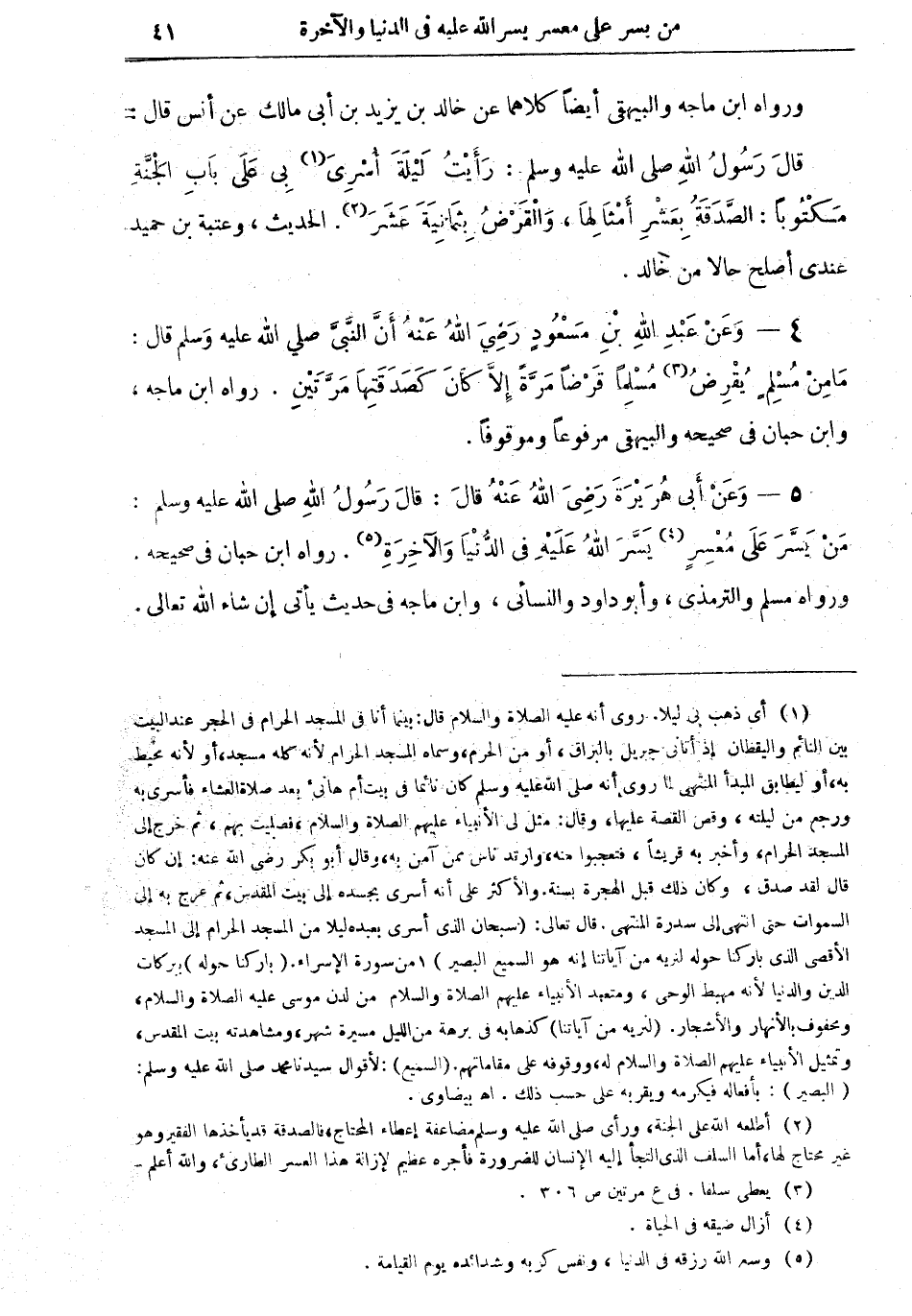 4 - وعنْ عبد الله بن مسعود رضي الله عنه أنَّ النبي صلى الله عليه وسلم قال: ما منْ مسلمٍ يُقرض (¬3) مسلماً قرضاً مرَّةً إلا كان كصدقتها مرَّتين. رواه ابن ماجه، وابن حبان في صحيحه والبيهقي مرفوعاً وموقوفاً.