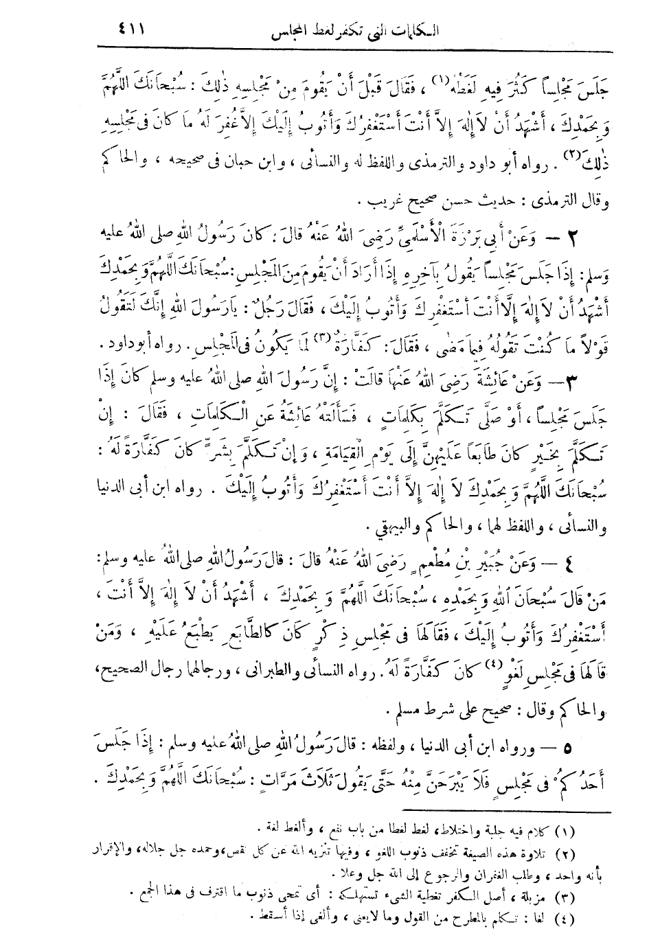 جلس مجلسا كثر فيه لغطه (¬1)، فقال قبل أن يقوم من مجلسه ذلك: سبحانك اللهمَّ وبحمدك، أشهد أن لا إله إلا أنت استغفرك وأتوب إليك إلا غفر له ما كان في مجلسهِ ذلك (¬2). رواه أبو داود والترمذي واللفظ له والنسائي، وابن حبان في صحيح، والحاكم وقال الترمذي: حديث حسن صحيح غريب.