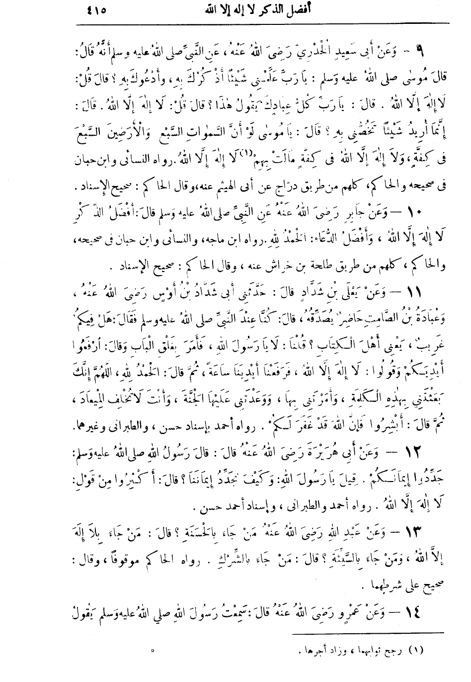 10 - وعن جابرٍ رضي الله عنه عن النبي صلى الله عليه وسلم قال: أفضل الذكر لا إله إلا الله، وأفضل الدعاء: الحمد لله. رواه ابن ماجه، والنسائي وابن حبان في صحيحه، والحاكم، كلهم من طريق طلحة بن خراش عنه، وقال الحاكم: صحيح الإسناد.