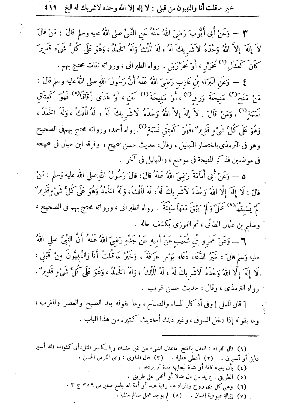 3 - وعنْ أبي أيُّوب رضي الله عنه عن النبي صلى الله عليه وسلم قال: من قال لا إله إلا الله وحده لا شريك له، له الملك، وله الحمد، وهو على كل شيء قدير كان كعدلِ (¬1) محرَّرٍ، أوْ محررَّين. رواه الطبراني، ورواته ثقات محتج بهم.