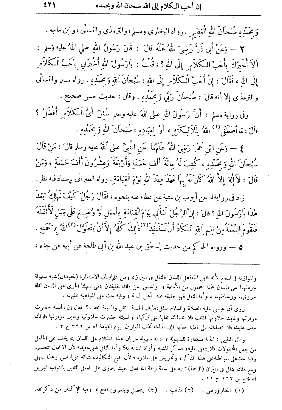 2 - وعنْ أبي ذرٍّ رضي الله عنه قال: قال رسول الله صلى الله عليه وسلم: ألا أخبرك بأحبِّ الكلام إلى الله؟. قلت: يا رسول الله أخبرني بأحب الكلام إلى الله، فقال: إن أحبَّ الكلام إلى الله: سبحان الله وبحمده. رواه مسلم والنسائي والترمذي إلا أنه قال: سبحان ربِّي وبحمده. وقال حديث حسن صحيح.