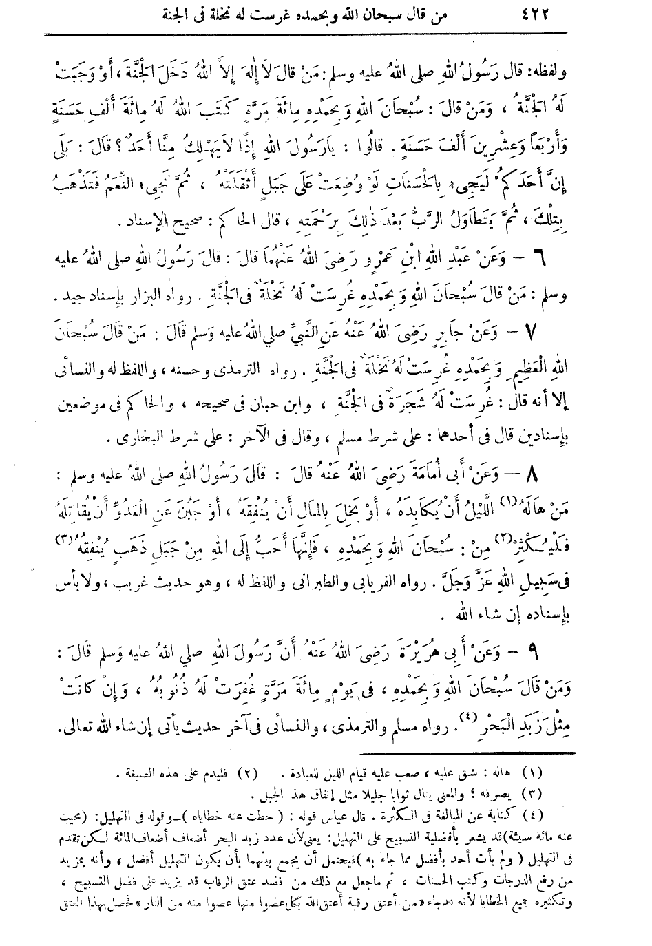 6 - وعنْ عبد الله بن عمروٍ رضي الله عنهما قال: قال رسول الله صلى الله عليه وسلم: من قال سبحان الله وبحمده غرستْ له نخلةٌ في الجنَّة. رواه البزار بإسناد جيد.