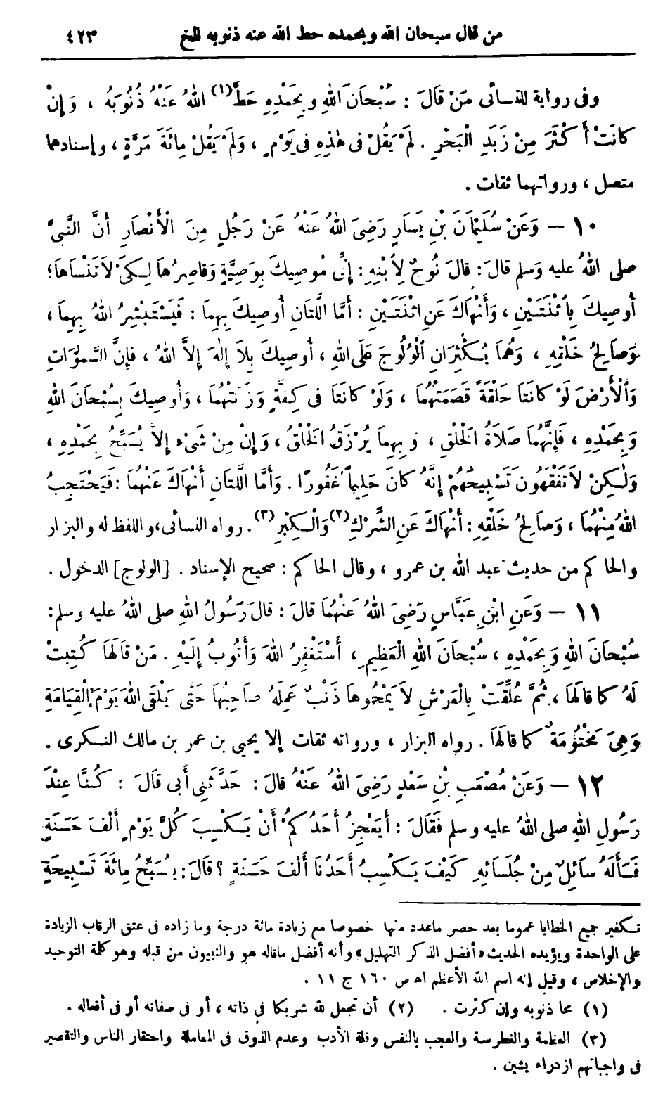 11 - وعن ابن عباس رضي الله عنهما قال: قال رسول الله، صلى الله عليه وسلم: سبحان الله وبحمده، سبحان الله العظيم، أستغفر الله وأتوب إليه من قالها كتبت له كما قالها، ثمَّ علِّقت بالعرش لا يمحوها ذنب عمله صاحبها حتى يلقى الله يوم القيامة وهي مختومة كما قالها. رواه البزار، ورواته ثقات إلا يحيى بن عمر بن مالك النكري.