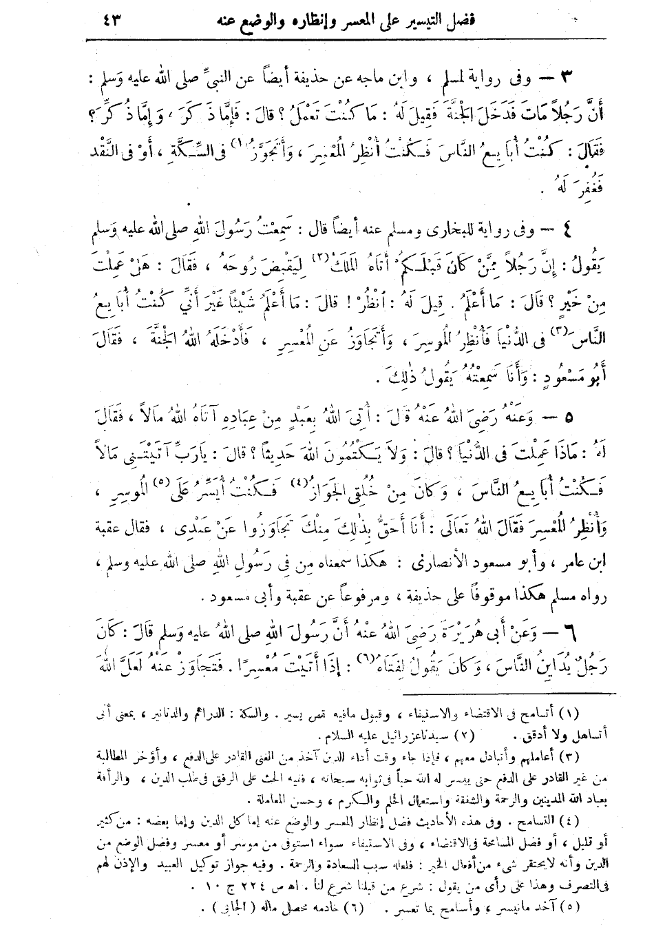 5 - وعنه رضي الله عنه قالى: أتى الله بعبدٍ من عباده آتاه الله مالاً، فقال له: ماذا عمْلت في الدنيا؟ قال: ولا يكْتُمون الله حديثاً؟ قال: يا رب آتيتني مالا فكنتُ أبايع الناس، وكان من خُلقي الجواز (¬4) فكنت أيسِّر على (¬5) الموسر، وأنظر المعسرَ فقال الله تعالى: أنا أحق بذلك منك تجاوزوا عن عبدي، فقال عقبة بن عامر، وأبو مسعود الأنصاري: هكذا سمعناه من في رسول الله صلى الله عليه وسلم هكذا موقوفاً على حذيفة، ومرفوعاً عن عقبة وأبي مسعود.