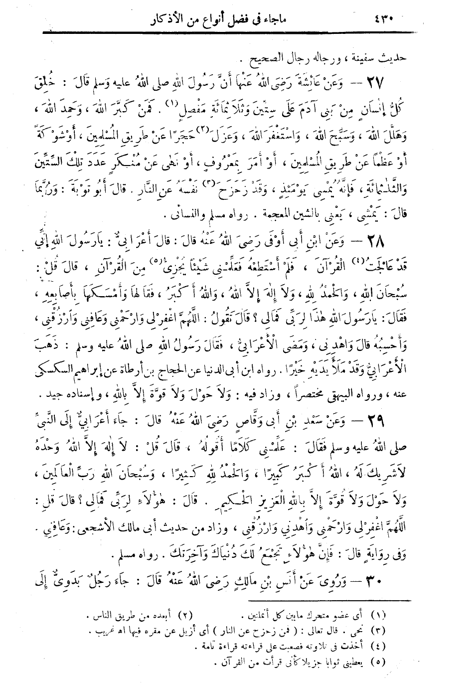 28 - وعن ابن أبي أوفى رضي الله عنه قال: قال أعرابي: يا رسول الله إنِّي قد عالجت (¬4) القرآن، فلمْ استطعه فعلِّمني شيئا يجزئ (¬5) من القرآن، قال قلْ: سبحان الله، والحمد لله، ولا إله إلا الله، والله أكبر، فقالها وأمسكها بأصابعهِ، فقال: يا رسول الله هذا لربي فمالي؟ قال تقول: اللهم اغفر لي وارحمني وعافني وارزقني، واحسبه قال واهدني، ومضى الأعرابي، فقال رسول الله صلى الله عليه وسلم: ذهب الأعرابي وقد ملأ يديه خيراً. رواه ابن أبي الدنيا عن الحجاج بن أرطاة عن إبراهيم السكسكي عنه، ورواه البيهقي مختصرا، وزاد فيه. ولا حول ولا قوة إلا بالله، وإسناده جيد.