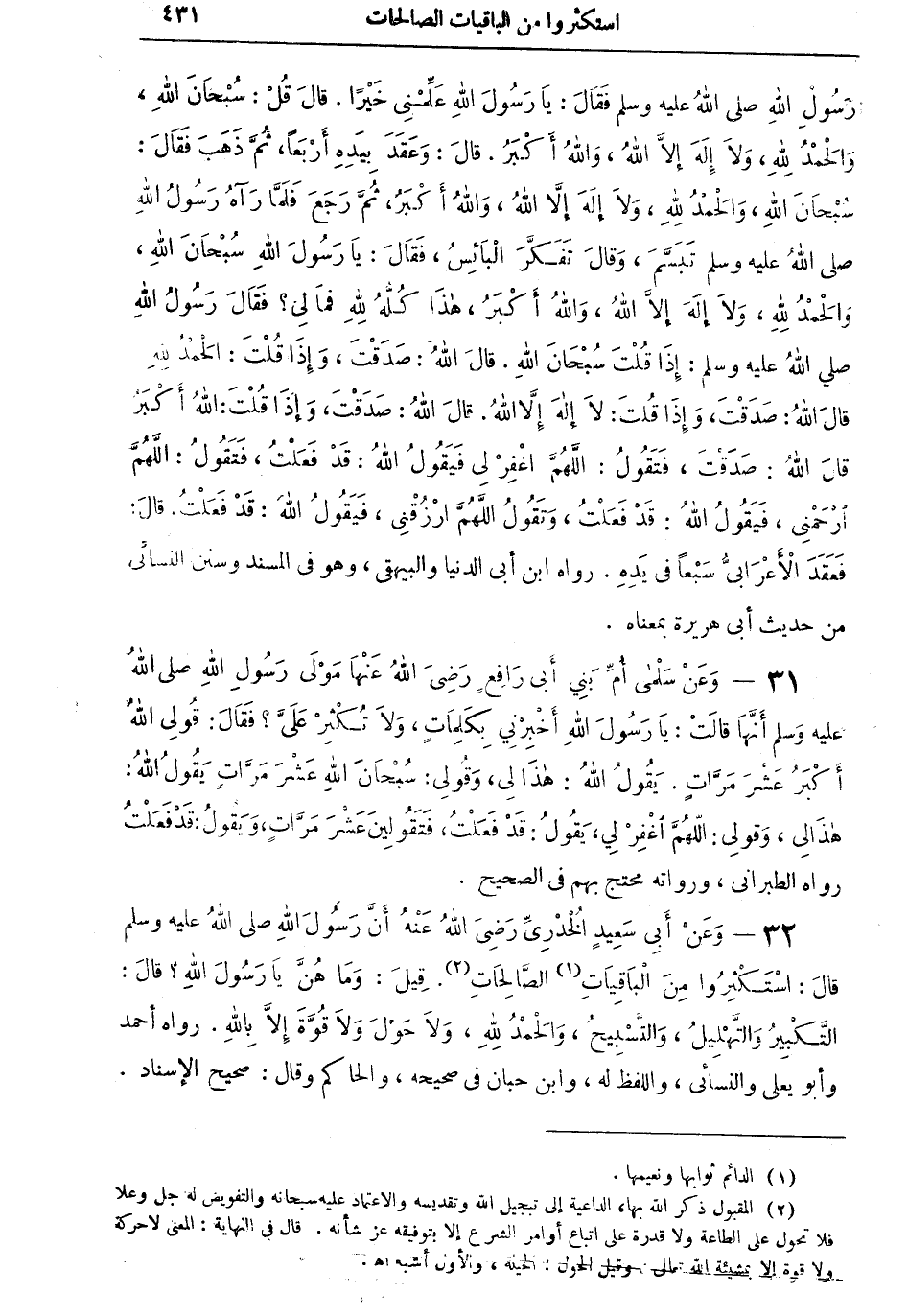 32 - وعنْ أبي سعيد الخدريِّ رضي الله عنه أنَّ رسول الله صلى الله عليه وسلم قال: استكثروا من الباقيات (¬1) الصالحات (¬2). قيل: وما هنَّ يا رسول الله؟ قال: التكبير والتهليل، والتسبيح، والحمد لله، ولا حول ولا قوة إلا بالله. رواه أحمد، وأبو يعلي والنسائي، واللفظ له، وابن حبان في صحيحه، والحاكم وقال: صحيح الإسناد.