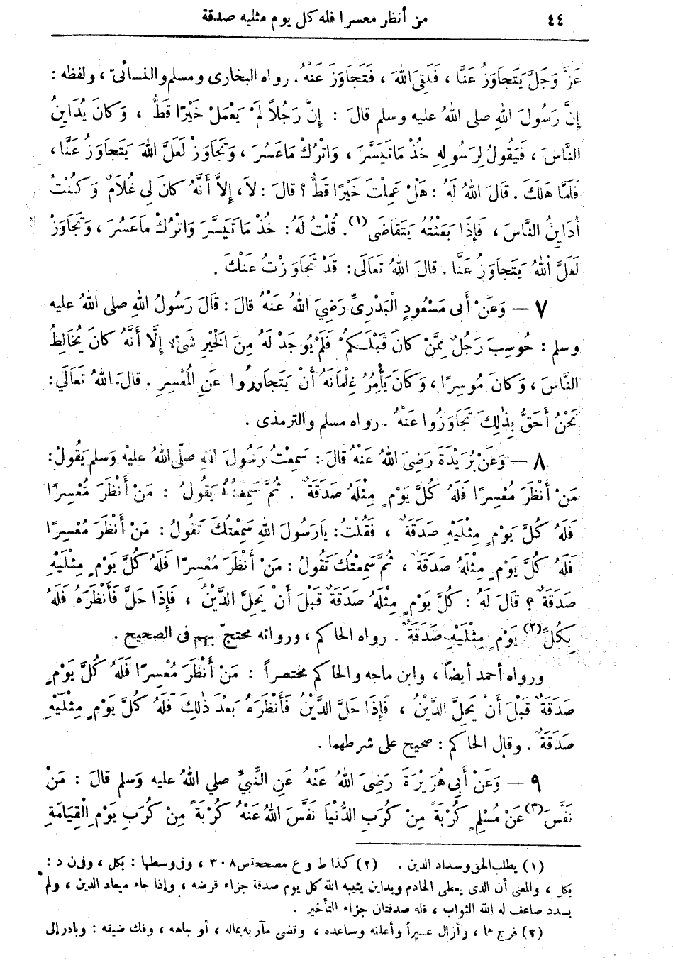 7 - وعنْ أبي مسعودٍ البدريِّ رضي الله عنه قال: قال رسول الله صلى الله عليه وسلم: حُوسب رجل ممنْ كان قبلكم فلمْ يوجد له من الخير شيء إلا أنَّه كان يخالط النَّاس، وكان موسراً، وكان يأمر غلمانه أن يتجاوزوا عن المعسرِ. قال الله تعالى: نحنُ أحقُّ بذلك تجاوزوا عنه. رواه مسلم والترمذي.