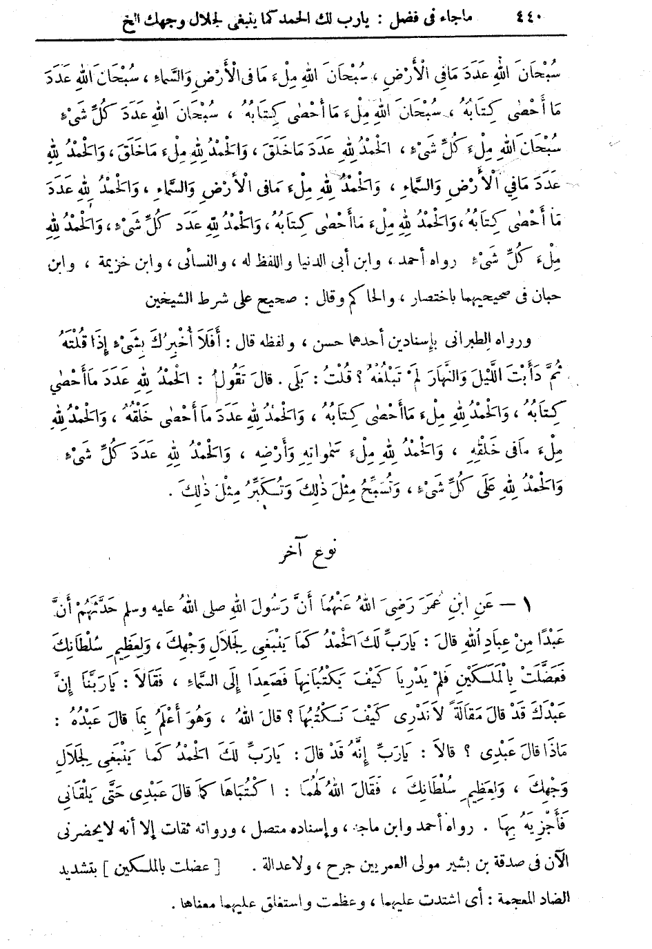 ورواه الطبراني بإسنادين أحدهما حسن، ولفظه قال: أفلا أخبرك بشيء إذا قلته، ثمَّ دأبت الليل والنهار لمْ تبلغه؟ قلتُ: بلى. قال تقول: الحمد لله عدد ما أحصى كتابه، والحمد لله ملء ما أحصى كتابه، والحمد لله عدد ما أحصى خلقه، والحمد لله ملء مافي خلقه، والحمد لله ملء سماواته وأرضه، والحمد لله عدد كل شيء، والحمد لله على كلِّ شيءٍ، وتسبيح مثل ذلك وتكبِّر مثل ذلك.