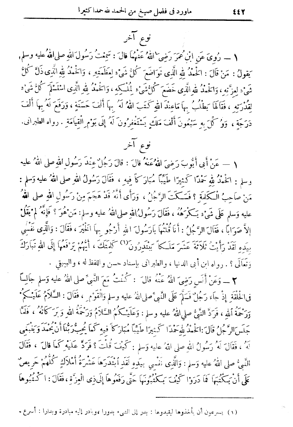 2 - وعنْ أنس رضي الله عنه قال: كنت مع النبي صلى الله عليه وسلم جالسا في الحلقة إذ جاء رجل فسلم على النبي صلى الله عليه وسلم والقوم، فقال: السلام عليكم ورحمة الله، فرد النبي صلى الله عليه وسلم: وعليكم السلام ورحمة الله وبركاته، فلما جلس الرجل قال: الحمد لله حمدا كثيراً طيباً مباركاً فيه كما يحب ربنا أن يحمد وينبغي له، فقال له رسول الله صلى الله عليه وسلم: كيف قلت؟ فرد عليه كما قال، فقال النبي صلى الله عليه وسلم: والذي نفسي بيده لقد ابتدرها عشرة أملاكٍ كلهم حريصٌ على أن يكتبها فما دروا كيف يكتبونها حتى رفعوها إلى ذي العزة، اكتبوها