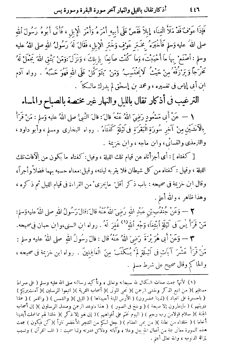 1 - عن أبي مسعودٍ رضي الله عنه قال: قال النبي صلى الله عليه وسلم: من قرأ بالآيتين من آخر سورة البقرة في ليلة كفتاه. رواه البخاري ومسلم، وأبو داود، والترمذي والنسائي، وابن ماجه، وابن خزيمة.