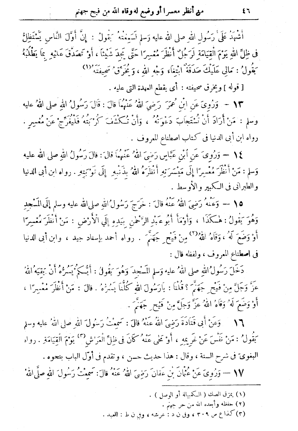 15 - وعنهُ رضي الله عنه قال: خرج رسول الله صلى الله عليه وسلم إلى المسجد وهو يقول: هكذا، وأوْمأ أبو عبد الرحمن بيدهِ إلى الأرض: من أنْظر معسراً، أوْ وضع له، وقاه الله (¬2) من فيْحِ جهنَّمَ. رواه أحمد بإسناد جيد، وابن أبي الدنيا في اصطناع المعروف، ولفظه قال: