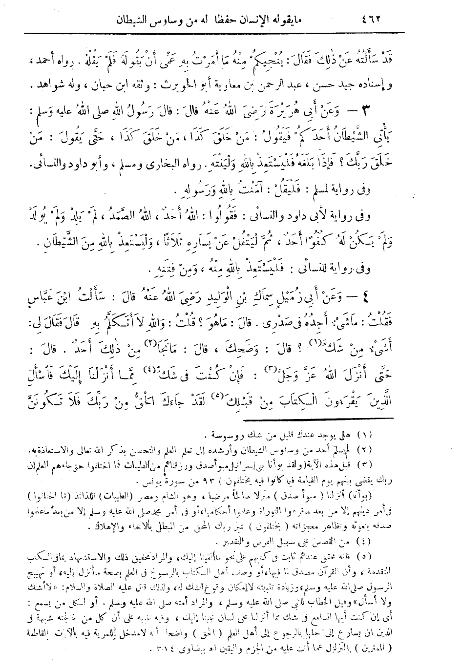 3 - وعن أبي هريرة رضي الله عنه قال: قال رسول الله صلى الله عليه وسلم: يأتي الشيطان أحدكمْ فيقول: من خلق كذا، من خلق كذا، حتى يقول: من خلق ربَّك؟ فإذا بلغه فليستعذْ بالله ولينتهِ. رواه البخاري ومسلم وأبو داود والنسائي.