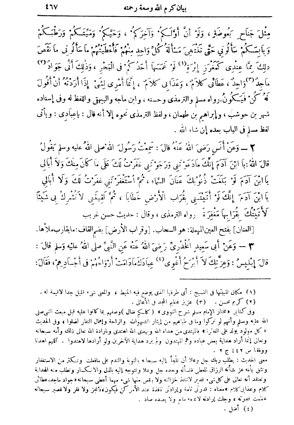 معنى الحديث: يطلب ربك جل وعلا أن تلجأ إليه سبحانه بالتوبة والندم على ما فعلت وتكثر من الاستغفار وتثق بأنه عز شأنه الرزاق المعطي فتسأله وحده جل وعلا وتتوجه إليه بالذل والانكسار وتطلب منه الهداية وتعتقد أنه تعالى على كل شيء قدير لاتنفذ خزائنه ولا ينقص منها شيئ مهما أعطى صبحانه (جواد ماجد. عطائي كلام وعذابي كلام) معناه: قدرتي تامة وإردتي نافذة عند الأمر كن فيكون لا عجز ولا فقر ولا تقصير سبحانه عظمت قدرته، وجلت إرادته لا يمنعه مانع ولا يصده صاد.