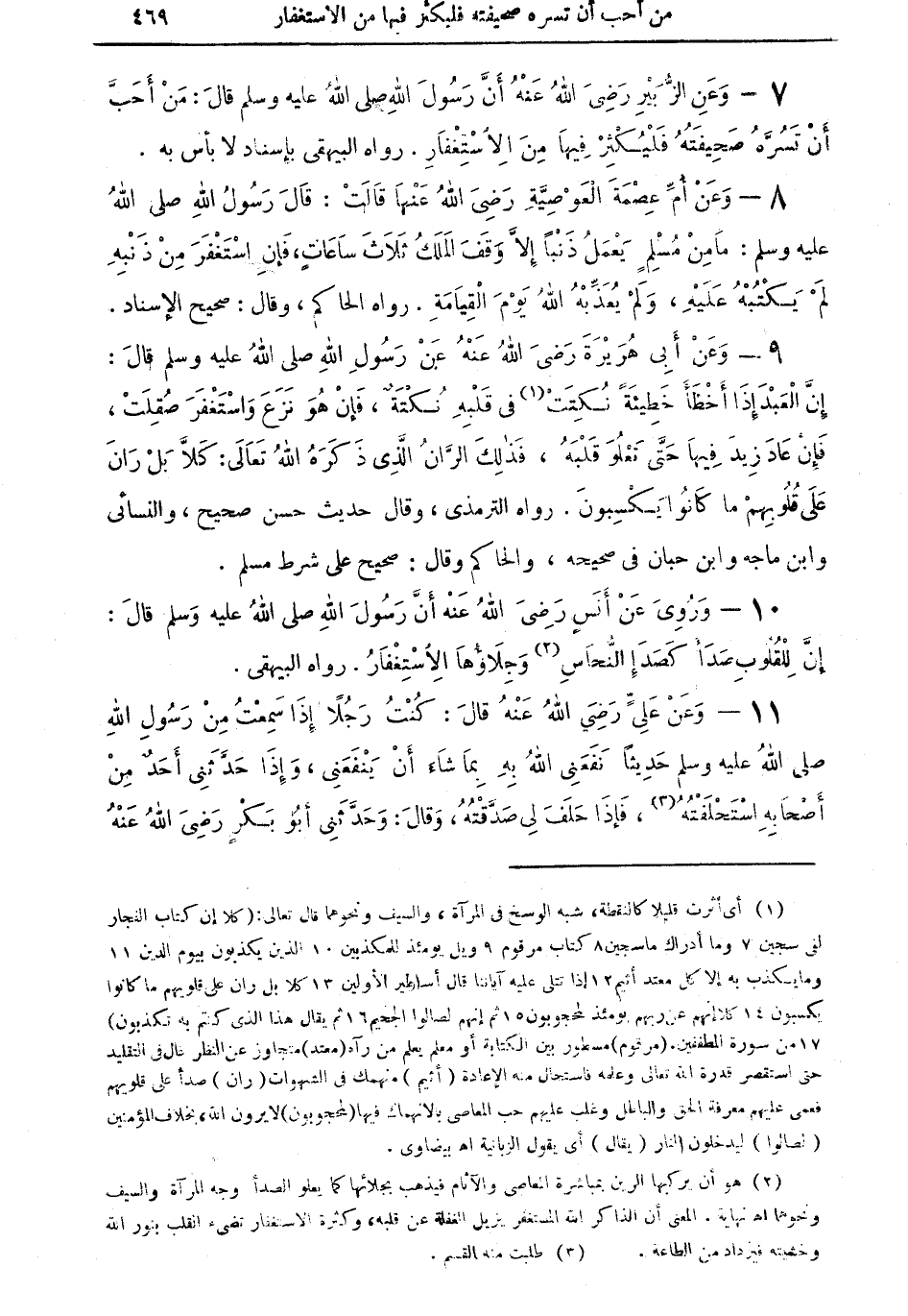 7 - وعن الزُّبير رضي الله عنه أنَّ رسول الله صلى الله عليه وسلم قال: من أحبَّ أن تسرَّه صحيفته فليكثر فيها من الاستغفار. رواه البيهقي بإسناد لا بأس به.
