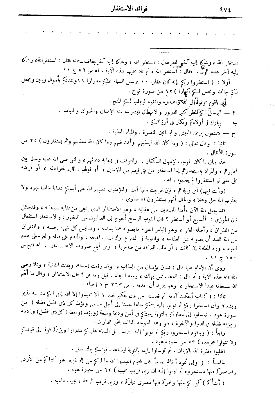 = استغفر الله، وشكا إليه آخر الفقر فقال: استغفر الله، وشكا إليه آخر جفاف بستانه فقال: استغفر الله، وشكا إليه آخر عدم الولد. فقال: استغفر الله، ثم تلا عليهم هذه الآية أهـ ص 76 جـ 11.