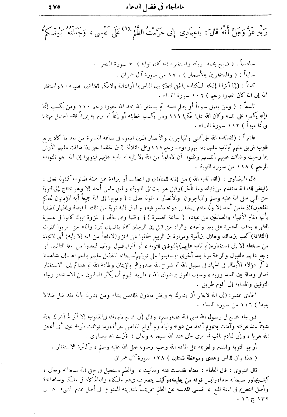 تاسعاً: (ومن يعمل سوءاً أو يظلم نفسه ثم يستغفر الله يجد الله غفورا رحيما 110 ومن يكسب إثماً فإنما يكسبه على نفسه وكان الله عليما حكيما 111 ومن يكسب خطيئة أو إثما ثم يرم به بريئاً فقد احتمل بهتانا وإثماً مبيناً) 112 سورة النساء.
