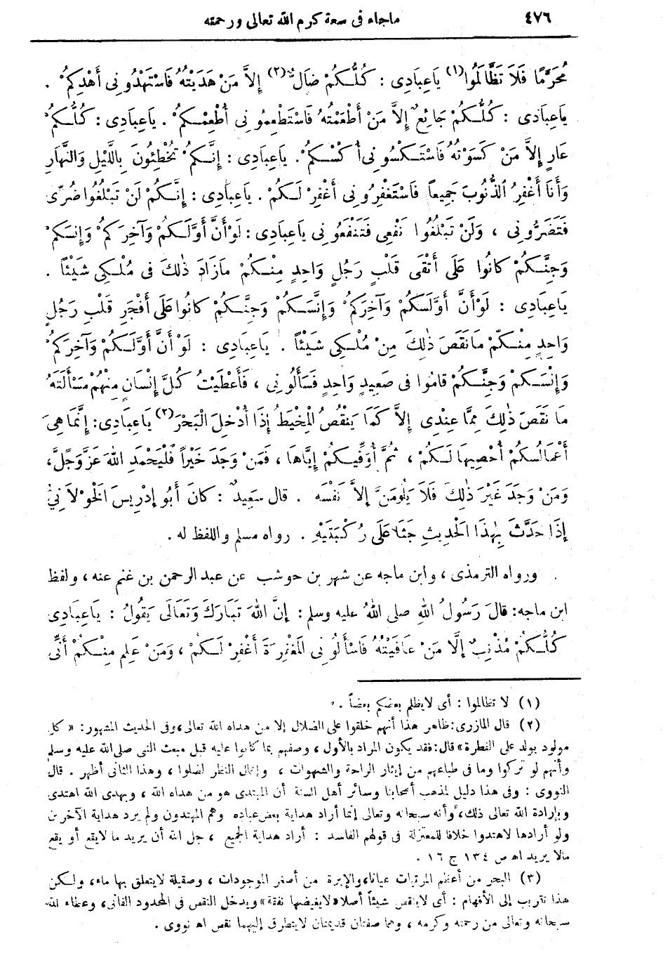 يا عبادي: كلكم جائع إلا من أطعمته فاستطعموني أطعمكمْ. يا عبادي: كلُّكمْ عارٍ إلا من كسوته فاستكسوني أكسكم. يا عبادي: إنكم تخطئون بالليل والنهار وأنا أغفر الذنوب جميعاً فاستغفروني أغفر لكمْ. يا عبادي: إنكم لن تبلغوا ضرِّي فتضرَّوني، ولن تبلغوا نفعي فتنفعوني. يا عبادي: لو أنَّ أوَّلكم وآخركم وإسنكمْ وجنَّكم كانوا على أتقى قلب رجلٍ واحد منكم ما زاد ذلك في ملكي شيئاً. يا عبادي: لوْ أن أوَّلكم وآخركم وإنسكم وجنكم كانوا على أفجر قلب رجلٍ واحدٍ منكم ما نقص من ملكي شيئا. يا عبادي: لو أن أوَّلكم وآخركمْ وإنسكم وجنكم قاموا في صعيدٍ واحدٍ فسألوني، فأعطيت كل إنسان منهم مسألته ما نقص ذلك مما عندي إلا كما ينقص المخيط إذا أدخل البحر (¬3) يا عبادي: إنما هي أعمالكمْ أحصيها لكمْ، ثمَّ أوفيكمْ إياها، فمن وجد خيرا فليحمد الله عز وجل، ومن وجد غير ذلك فلا يلومنَّ إلا نفسه. قال سعيد: كان أبو إدريس الخولانيُّ إذا حدَّث بهذا الحديث جثا على ركبتيه. رواه مسلم واللفظ له.