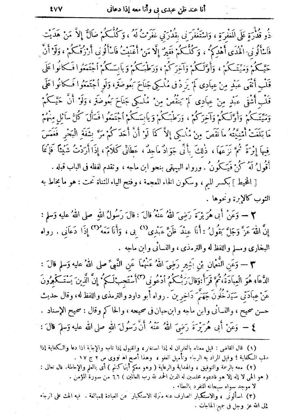 3 - وعن النعمان بن بشيرٍ رضي الله عنهما عن النبي صلى الله عليه وسلم قال: الدعاء هو العبادة، ثمَّ قرأ: وقال ربكم ادعوني (¬3) أستجبْ لكمْ إنَّ الذين يستكبرون عن عبادتي سيدخلون جهنَّم داخرين. رواه أبو داود والترمذي واللفظ له، وقال: حديث حسن صحيح، والنسائي وابن ماجه وابن حبان في صحيحه، والحاكم وقال: صحيح الإسناد.