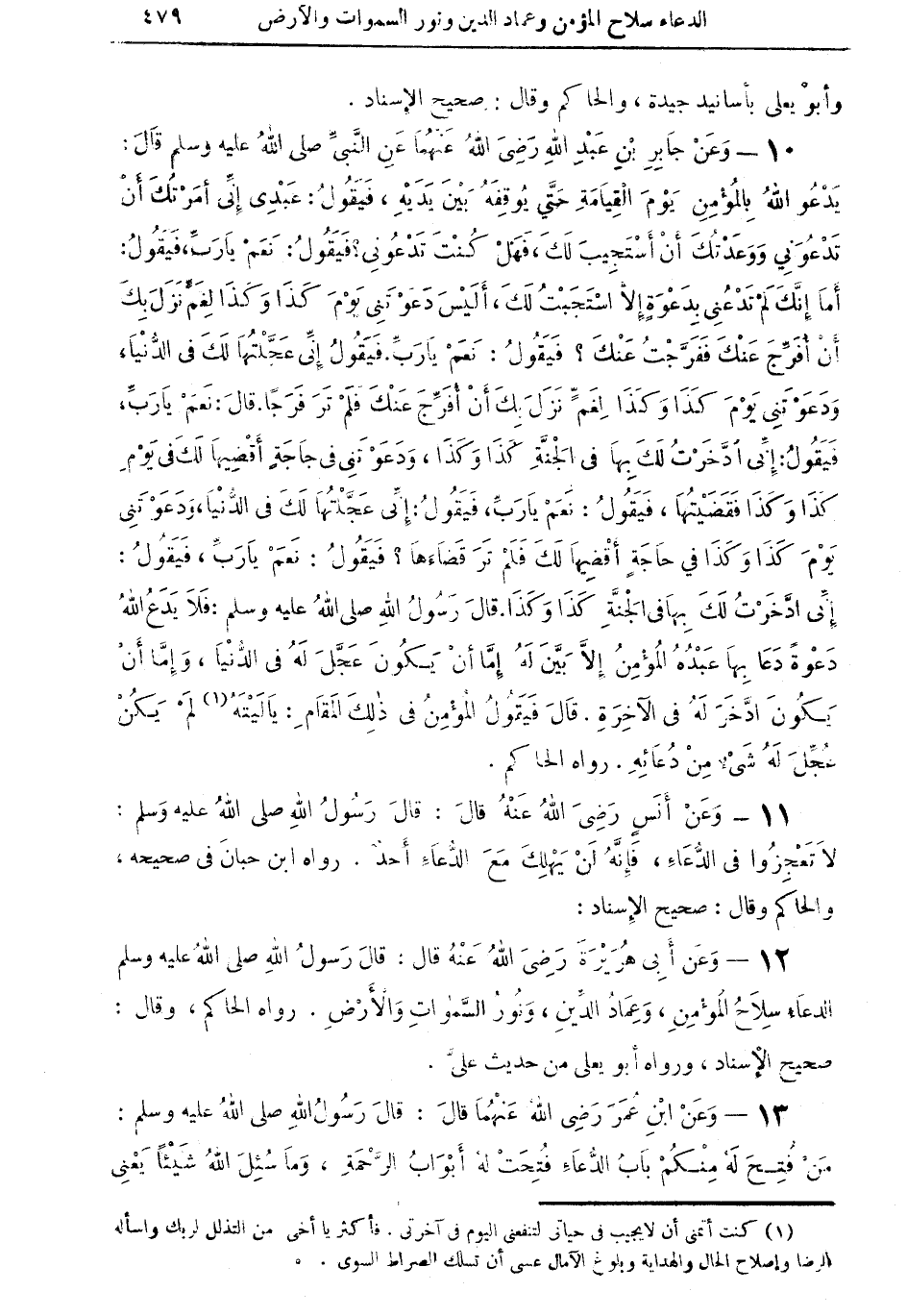 12 - وعنْ أبي هريرة رضي الله عنه قال: قال رسول الله صلى الله عليه وسلم: الدعاء سلاح المؤمن، وعماد الدِّين، ونور السماوات والأرض. رواه الحاكم، وقال: صحيح الإسناد، ورواه أبو يعلي من حديث عليّ.