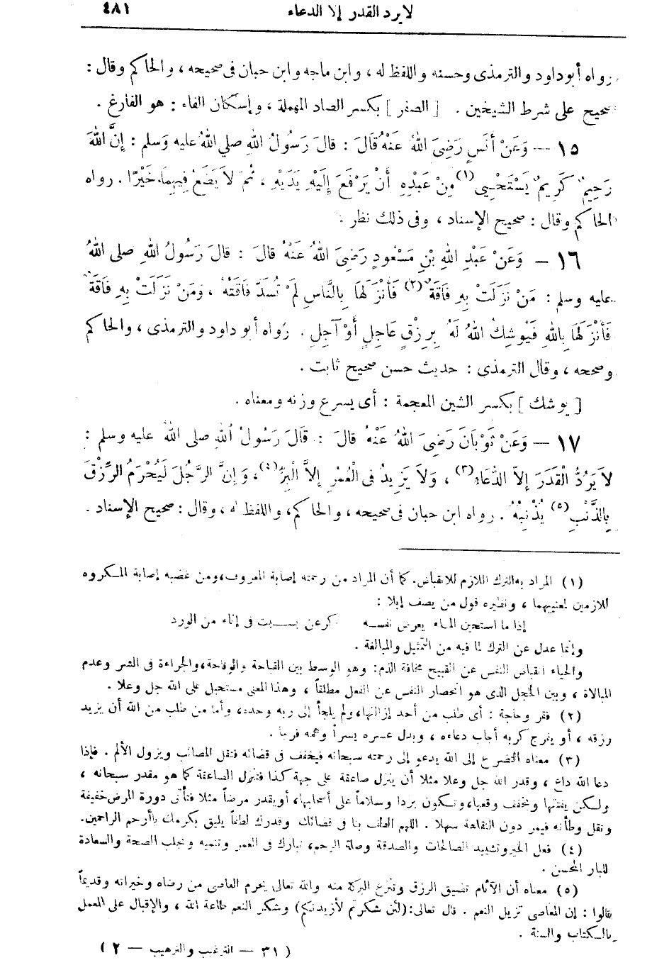 17 - وعن ثوبان رضي الله عنه قال: قال رسول الله صلى الله عليه وسلم: لا يردُّ القدر إلا الدعاء (¬3)، ولا يزيد في العمر إلا البرُّ (¬4)، وإنَّ الرجل ليحرم الرِّزق بالذنب (¬5) يذنبه. رواه ابن حبان في صحيحه، والحاكم واللفظ له، وقال: صحيح الإسناد.