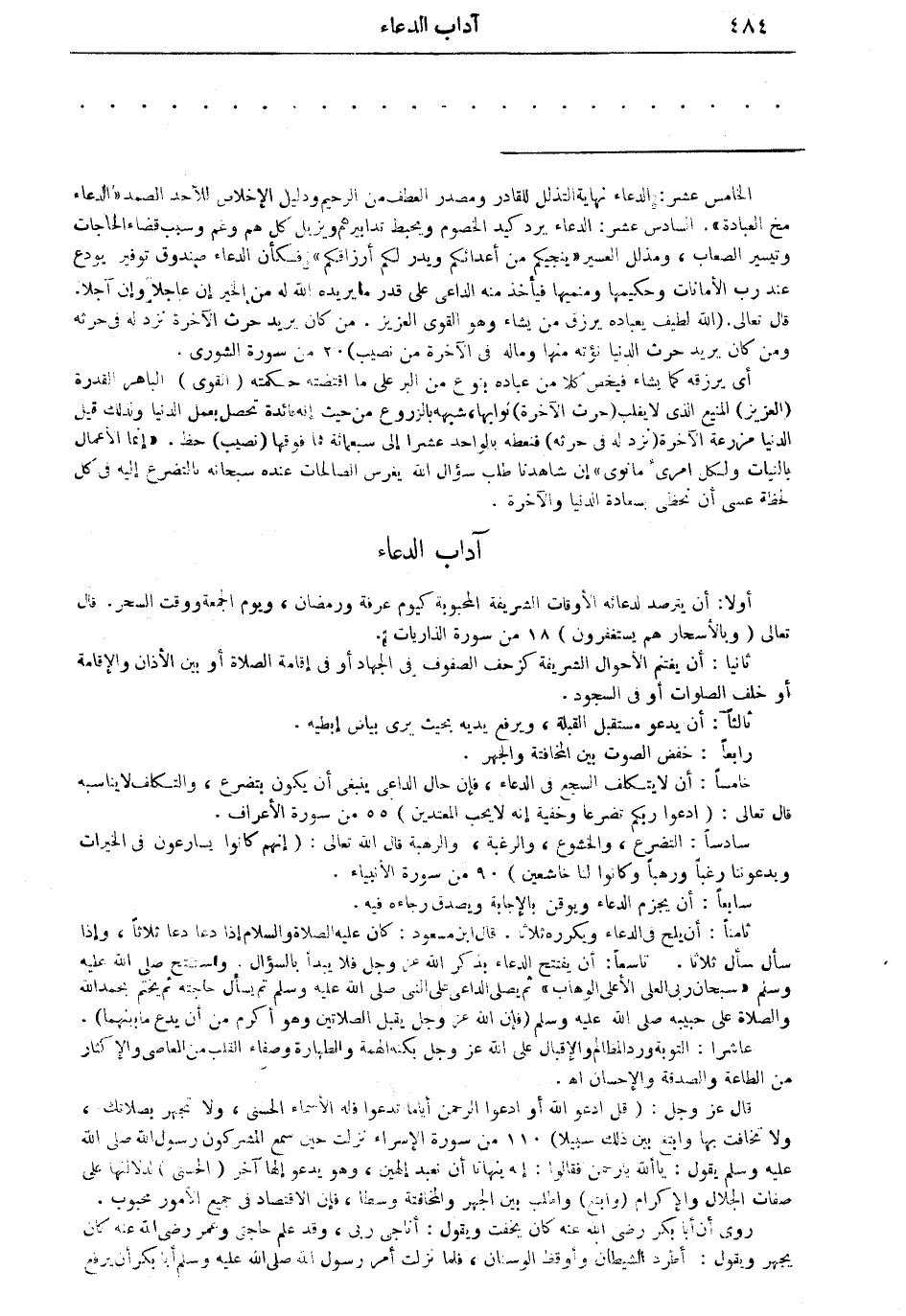 خامساً: أن لا يتكلف السجع في الدعاء، فإن حال الداعي ينبغي أن يكون بتضرع، والتكلف لا يناسبه قال تعالى: (ادعوا ربكم تضرعاً وخفية إنه لا يحب المعتدين) 55 من سورة الأعراف.