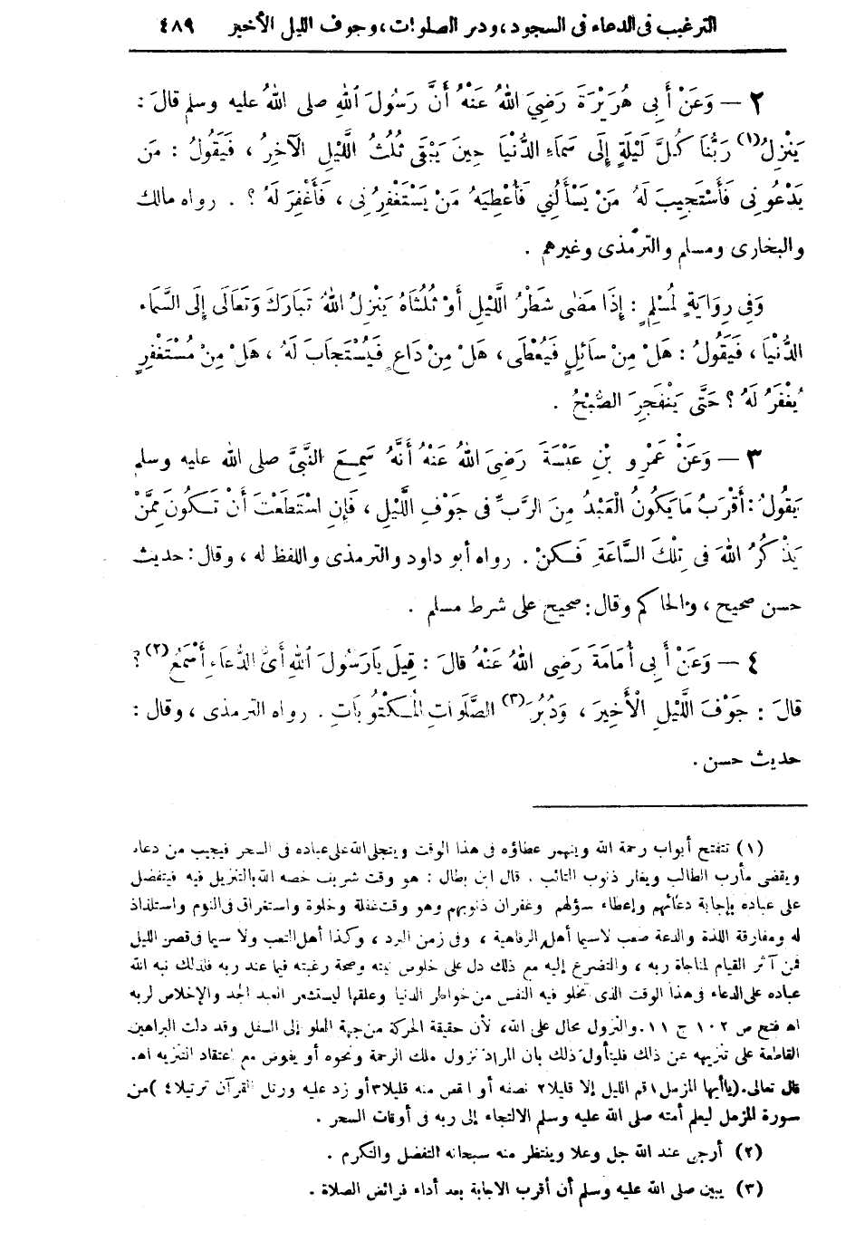 3 - وعنْ عمرو بن عبسة رضي الله عنه أنه سمع النبي صلى الله عليه وسلم يقول: أقرب ما يكون العبد من الرب في جوف الليل: فإن استطعت أن تكون ممن يذكر الله في تلك الساعة فكنْ. رواه أبو داود والترمذي واللفظ له، وقال: حديث حسن صحيح، والحاكم وقال: صحيح على شرط مسلم.