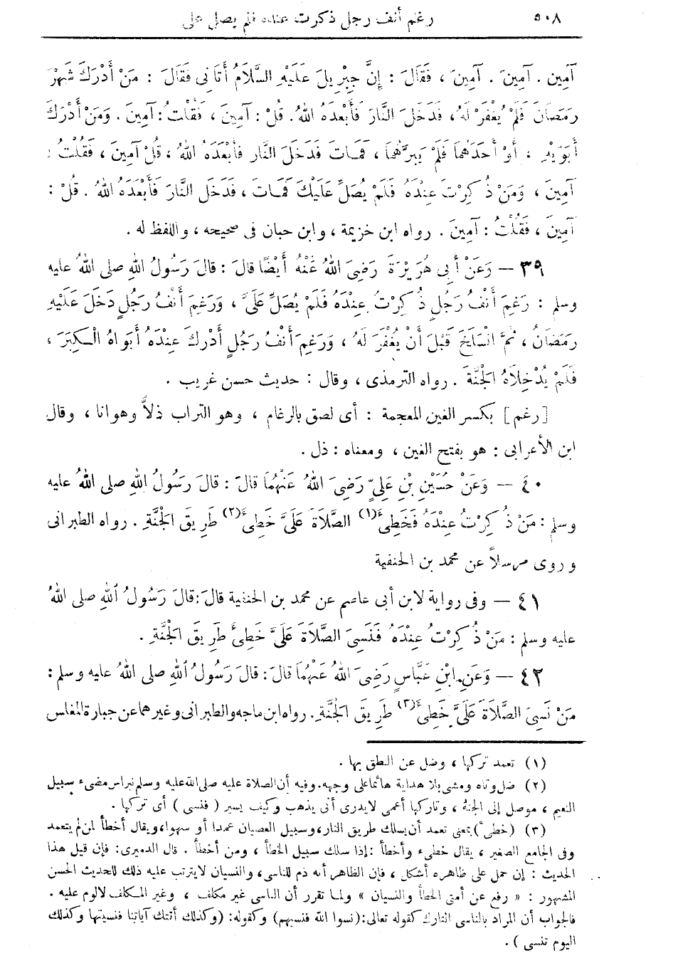 39 - وعنْ أبي هريرة رضي الله عنه أيضا قال: قال رسول الله صلى الله عليه وسلم رغم أنف رجلٍ ذكرت عنده فلم يصلِّ عليَّ، ورغم أنف رجل دخل عليه رمضان، ثمَّ انسلخ قبل أن يغفر له، ورغم أنف رجلٍ أدرك عنده أبواه الكبر، فلمْ يدخلاه الجنَّة. رواه الترمذي، وقال: حديث حسن غريب.
