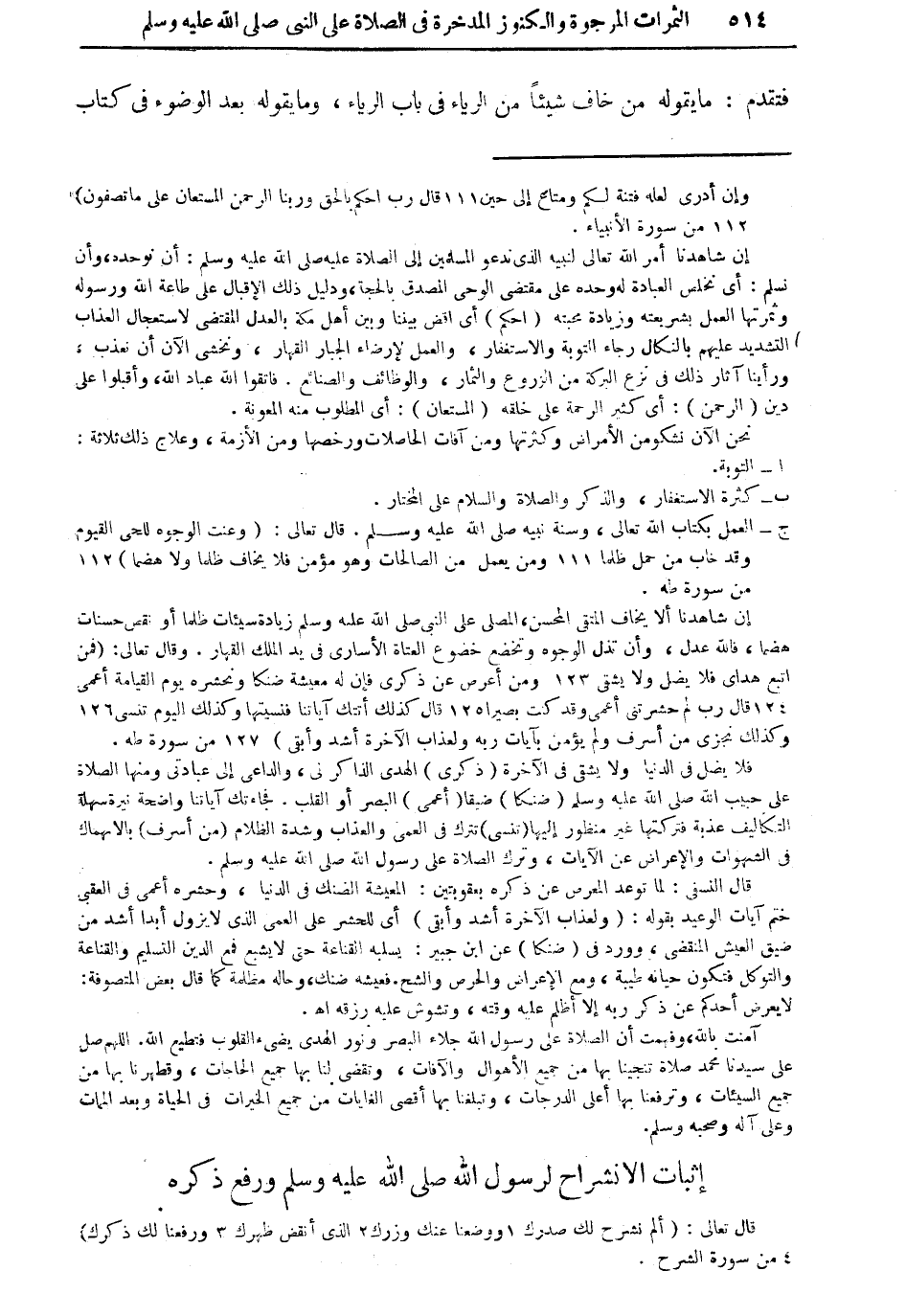 فلا يضل في الدنيا ولا يشقى في الآخرة (ذكرى) الهدي الذاكر لي، والداعي إلى عبادتي، ومنها الصلاة على حبيب الله صلى الله عليه وسلم (ضنكا) ضيقا (أعمى) البصر أو القلب. فجاءتك آياتنا واضحة نيرة سهلة التكاليف عذبة فتركتها غير منظور إليها (تنسى) تترك في العمى والعذاب وشدة الظلام (من أسرف) بالانهماك في الشهوات والإعراض عن الآيات، وترك الصلاة على رسول الله صلى الله عليه وسلم.