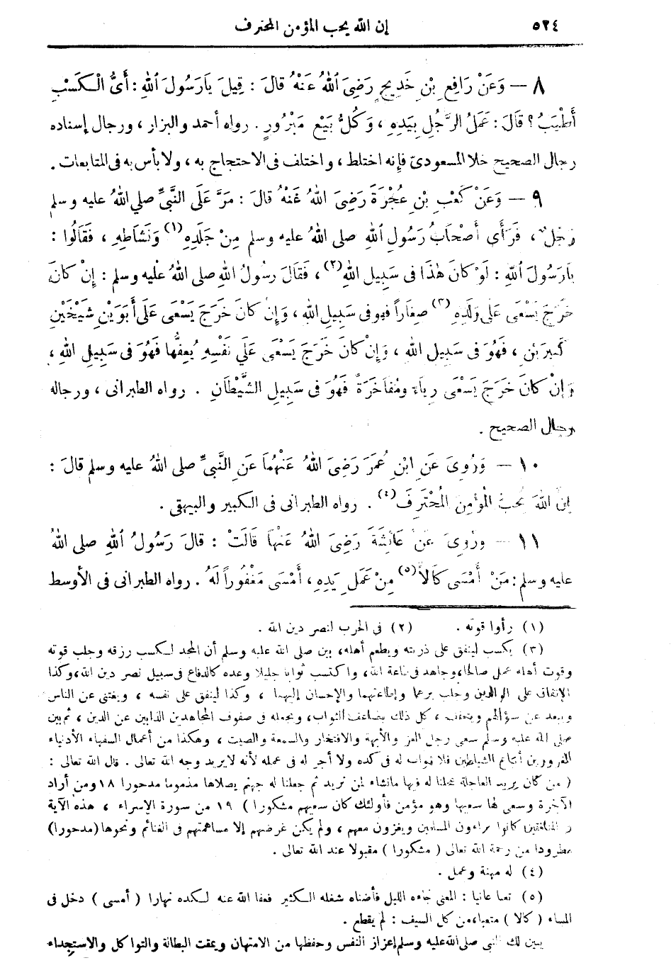 9 - وعنْ كعب بن عجرة رضي الله عنه قال: مرَّ على النبي صلى الله عليه وسلم رجلٌ، فرأى أصحاب رسول الله صلى الله عليه وسلم من جلدهِ (¬1) ونشاطهِ، فقالوا: يا رسول الله: لوْ كان هذا في سبيل الله (¬2)، فقال رسول الله صلى الله عليه وسلم: إن كان خرج يسعى على ولدهِ (¬3) صغاراً فهو في سبيل الله، وإنْ كان خرج يسعى على أبوينِ شيخين كبيرين فهو في سبيل الله، وإنْ كان خرج يسعى على نفسه يعفُّها فهو في سبيل الله، وإنْ كان خرج يسعى رباء ومفاخرةً فهو في سبيل الشيطان. رواه الطبراني، ورجاله رجال الصحيح.