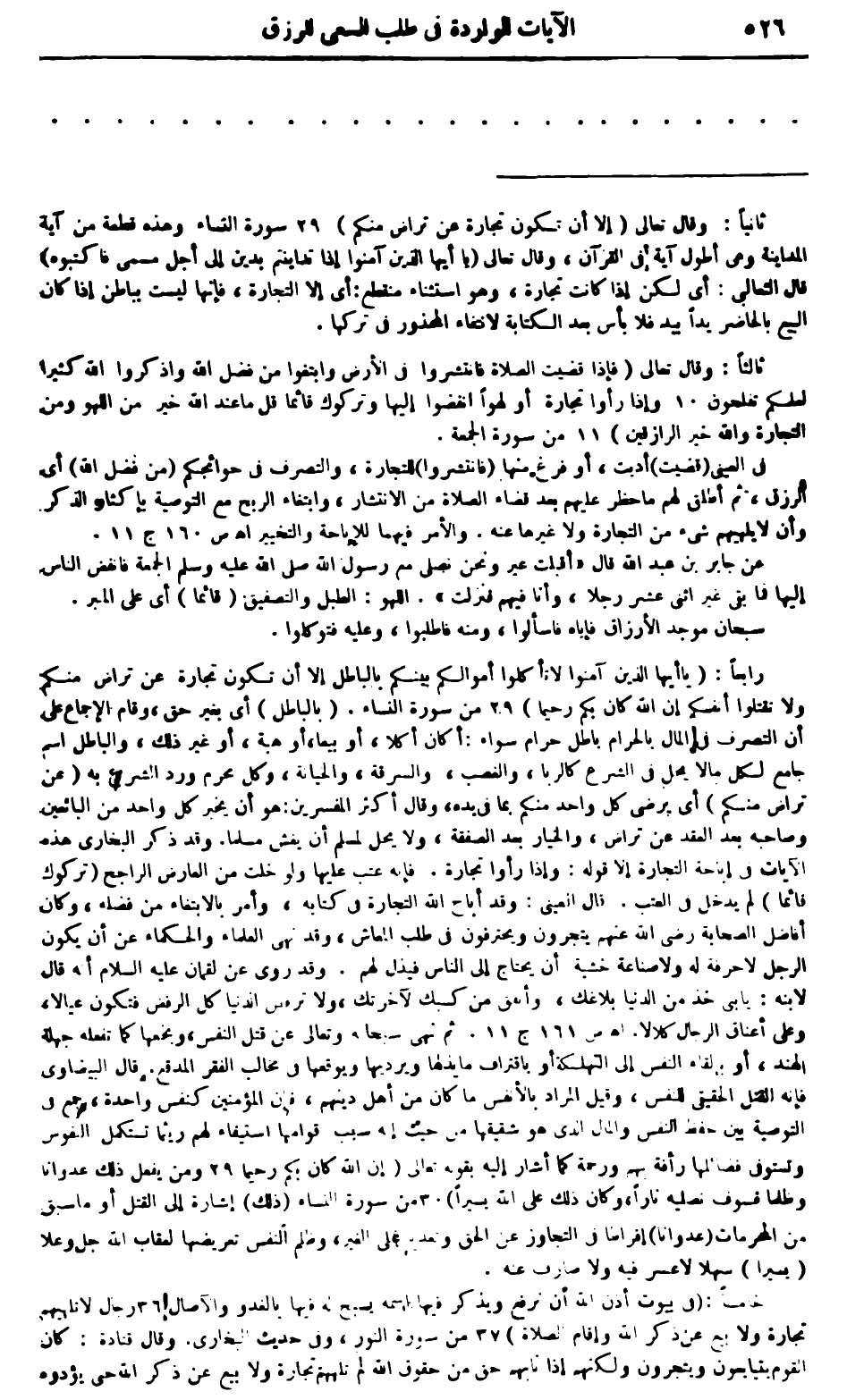 رابعاً: (يا أيها الذين آمنوا لا تأكلوا أموالكم بينكم بالباطل إلا أن تكون تجارة عن تراض منكم ولا تقتلوا أنفسكم إن الله كان بكم رحيما) 29 من سورة النساء. (بالباطل) أي بغير حق، وقام الإجماع على أن التصرف في المال بالحرام باطل حرام سواء: أكان أكلا، أو بيعا، أو هبة، أو غير ذلك، والباطل اسم جامع لكل مالا يحل في الشرع كالربا، والغصب، والسرقة، والخيانة، وكل محرم ورد الشرع به (من تراض منكم) أي يرضى كل واحد منكم بما في يده، وقال أكثر المفسرين: هو أن يخبر كل واحد من البائعين صاحبه بعد العقد عن تراض، والخيار بعد الصفقة، ولا يحل لمسلم أن يغش مسلماً. وقد ذكر البخاري هذه الآيات في إباحة التجارة إلا قوله: وإذا رأوا تجارة. فإنه عتب عليها ولو خلت من العارض الراجح (تركوك قائما) لم يدخل في العتب. قال العيني: وقد أباح الله التجارة في كتابه، وأمر الابتغاء من فضله، وكان أفاضل الصحابة رضي الله عنهم يتجرون ويحترفون في طلب المعاش، وقد نهى العلماء والحكماء عن أن يكون الرجل لا حرفة له ولا صناعة خشية أن يحتاج إلى الناس فيذل لهم. وقد روي عن لقمان عليه السلام أنه قال لابنه: يا بني خذ من الدنيا بلاغك، وأنفق من كسبك لآخرتك، ولا ترفض الدنيا كل الرفض فتكون عيالا، وعلى أعناق الرجال كلالا. أهـ ص 161 جـ 11. ثم نهى سبحانه وتعالى عن قتل النفس، وبخعها كما تفعله جهلة الهند، أو بإلقاء النفس إلى التهلكة أو باقتراف ما يذلها، ويرديها، ويوقعها في مخالف الفقر المدقع.