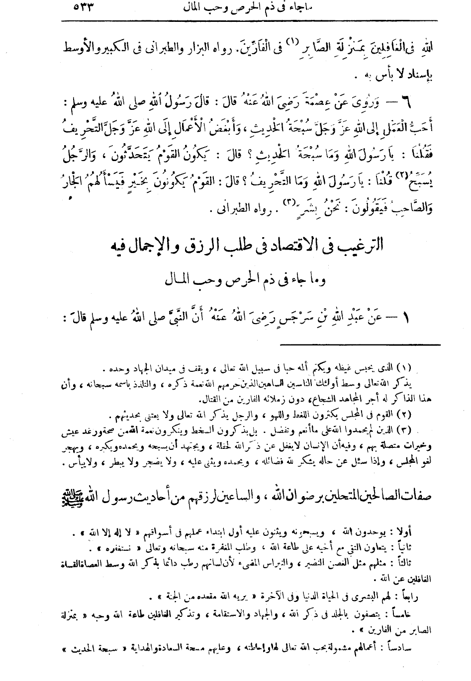 6 - وروي عن عصمة رضي الله عنه قال: قال رسول الله صلى الله عليه وسلم: أحبُّ العمل إلى الله عزَّ وجلَّ سبحة الحديث، وأبغض الأعمال إلى الله عزَّ وجلَّ التحريف فقلنا: يا رسول الله وما سبحة الحديث؟ قال: يكون القوم يتحدثون، والرَّجل يسبح (¬2) قلنا: يا رسول الله وما التحريف؟ قال: القوم يكونون بخيرٍ فيسألهم الجار والصاحب، فيقولون: نحن بشرٍ (¬3). رواه الطبراني.