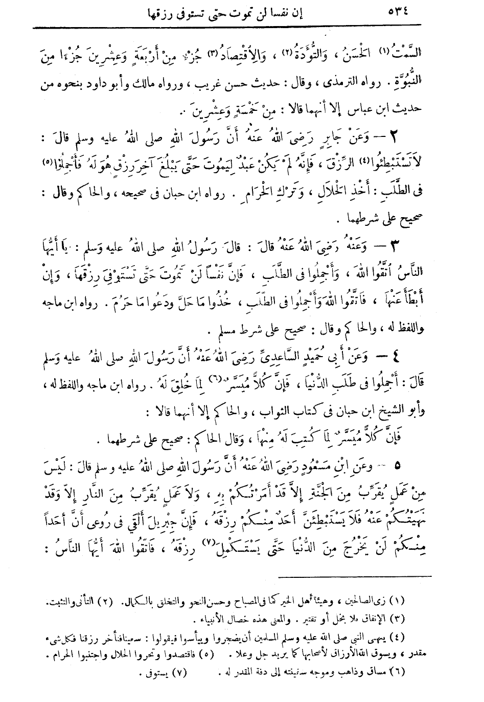 3 - وعنه رضي الله عنه قال: قال رسول الله صلى الله عليه وسلم: يا أيها الناس اتَّقوا الله، وأجملوا في الطلب، فإن نفساً لن تموت حتى تستوفي رزقها، وإنْ أبطأ عنها، فاتقوا الله وأجملوا في الطلب، خذوا ما حلَّ ودعوا ما حرم. رواه ابن ماجه واللفظ له، والحاكم وقال: صحيح على شرط مسلم.