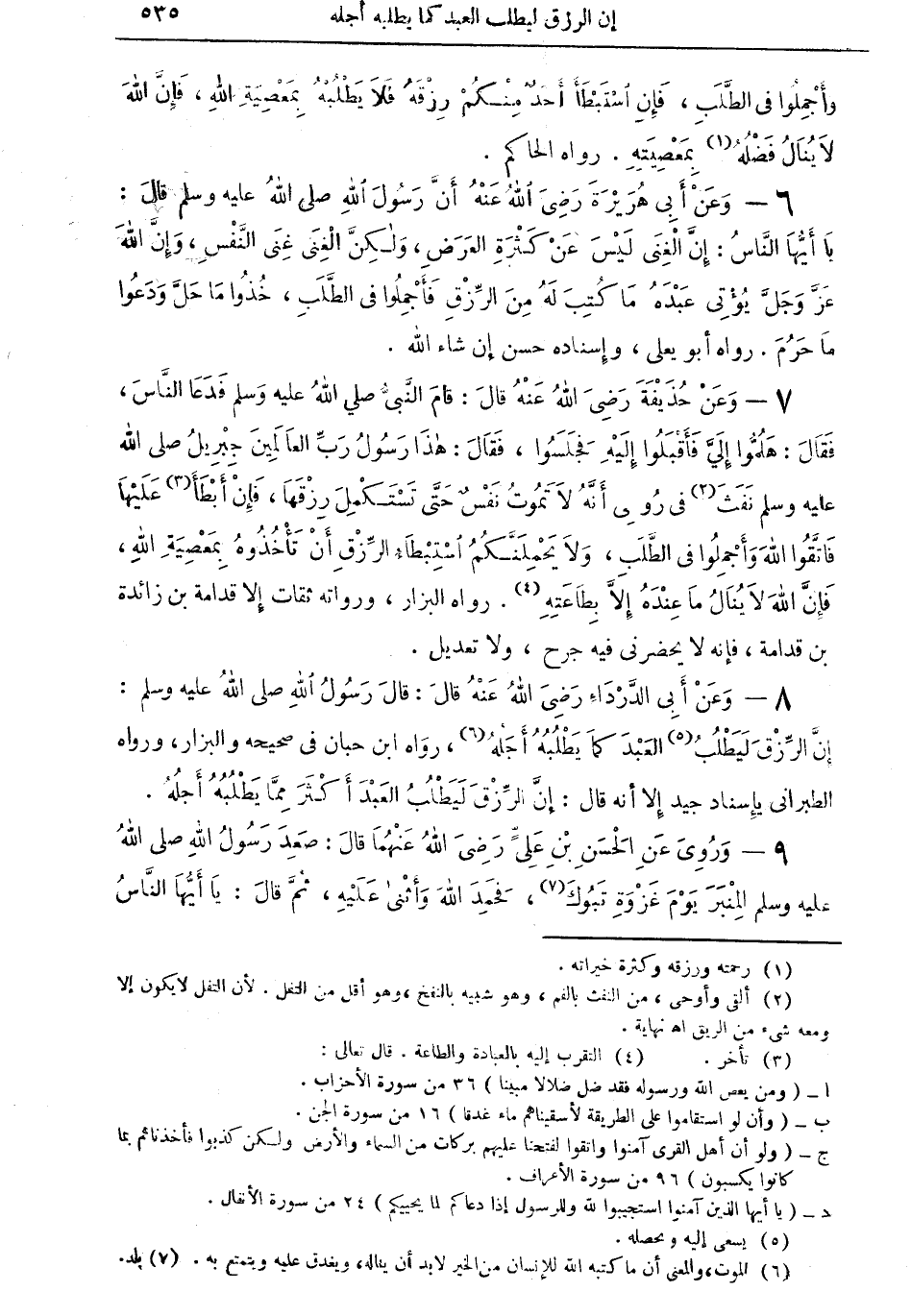 6 - وعن أبي هريرة رضي الله عنه أنَّ رسول الله صلى الله عليه وسلم قال: يا أيُّها الناس: إن الغني ليس عن كثرة العرض، ولكنَّ الغني غنى النفس، وإن الله عزَّ وجلَّ يؤتي عبده ما كتب له من الرِّزق فأجملوا في الطَّلب، خذوا ما حلَّ ودعوا ما حرم. رواه أبو يعلي، وإسناده حسن إن شاء الله.