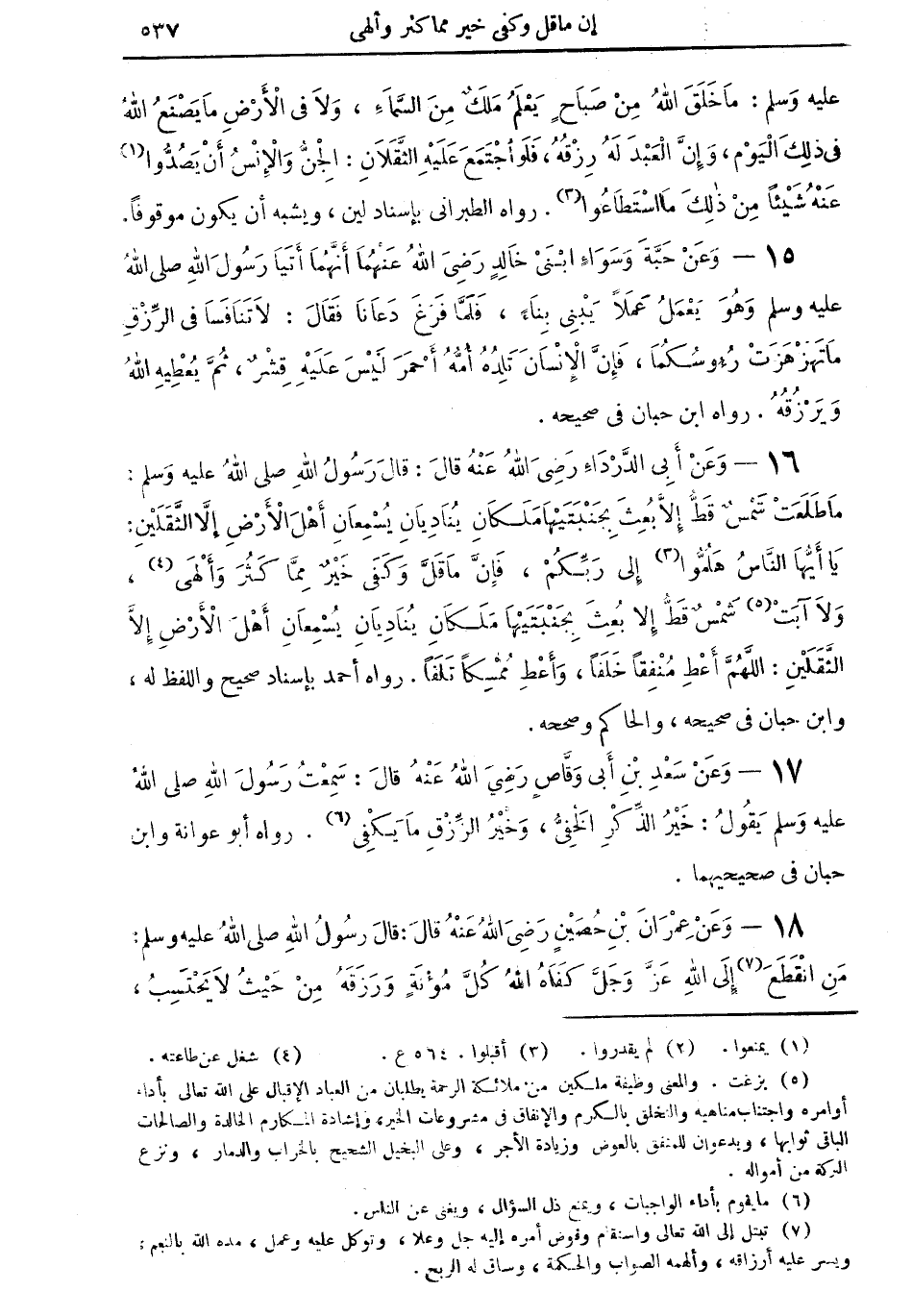 17 - وعنْ سعد بن أبي وقَّاص رضي الله عنه قال: سمعت رسول الله صلى الله عليه وسلم يقول: خير الذكر الخفيُّ، وخير الرِّزق ما يكفي (¬6). رواه أبو عوانة وابن حبان في صحيحهما.