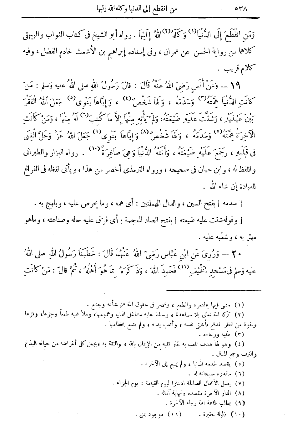 19 - وعن أنسٍ رضي الله عنه قال: قال رسول الله صلى الله عليه وسلم: منْ كانت الدنيا همَّته (¬3) وسدمهُ، ولها شخصٌ (¬4)، وإيَّاها ينوي (¬5) جعل الله الفقر بين عينيه، وشتَّتَ عليه ضيعته، ولميأته منها إلا ما كتب (¬6) له منها، ومن كانت الآخرة همَّته (¬7) وسدمه، ولها شخصٌ (¬8) وإياها ينوي (¬9) جعل الله عز وجلَّ الغني في قلبه، وجمع عليه ضيعته، وأتته الدنيا وهي صاغرة (¬10). رواه البزار والطبراني واللفظ له، وابن حبان في صحيحه، ورواه الترمذي أخصر من هذا، ويأتي لفظه في الفراغ للعبادة إن شاء الله.