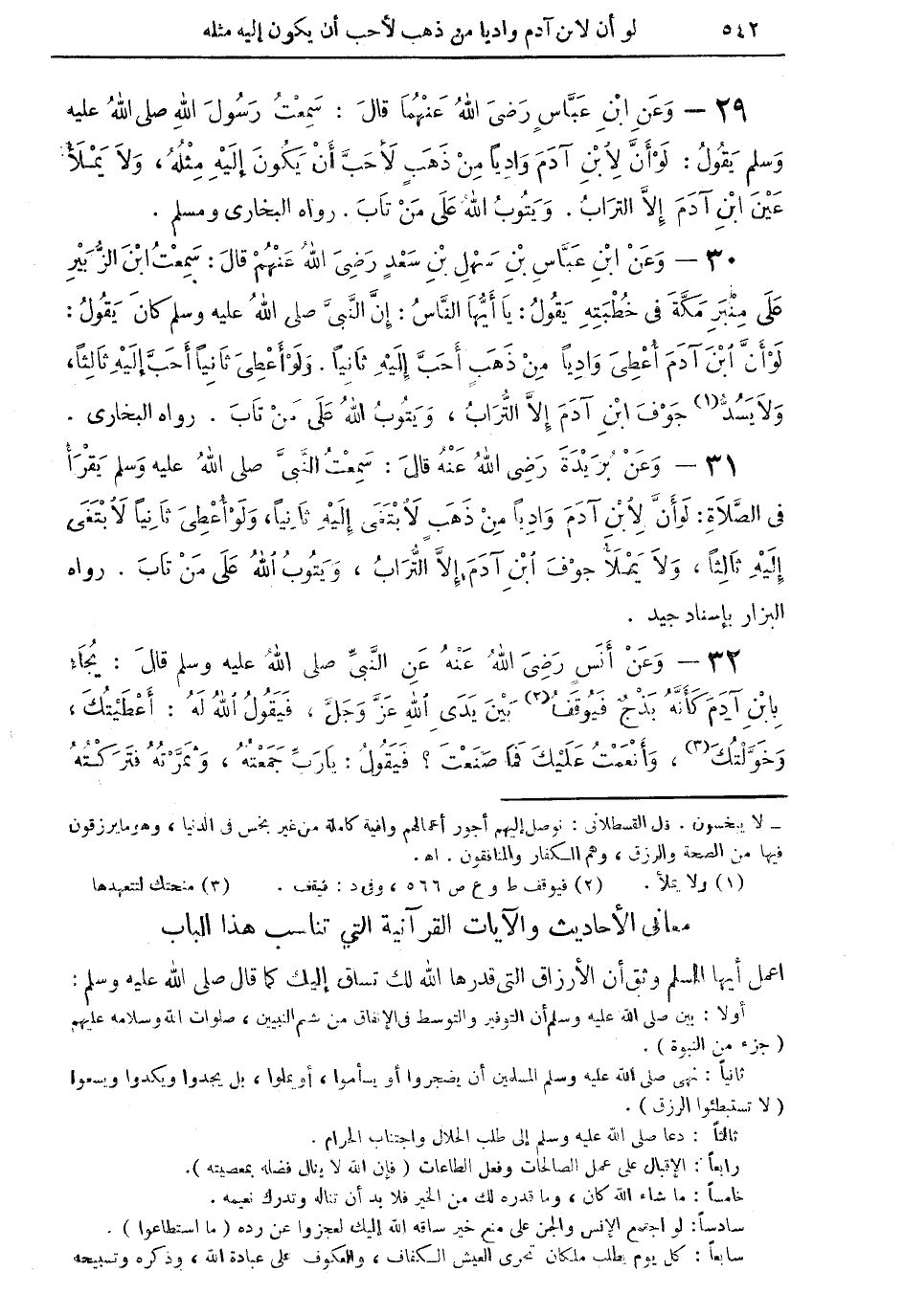 31 - وعن بريدة رضي الله عنه قال: سمعت النبي صلى الله عليه وسلم يقرأ في الصلاة: لو أن لابن آدم وادياً من ذهبٍ لابتغى إليه ثانياً، ولو أعطى ثانياً لابتغى إليه ثالثاً: ولايملأ جوف ابن آدم إلا التراب، ويتوب الله على من تاب. رواه البزار بإسناد جيد.